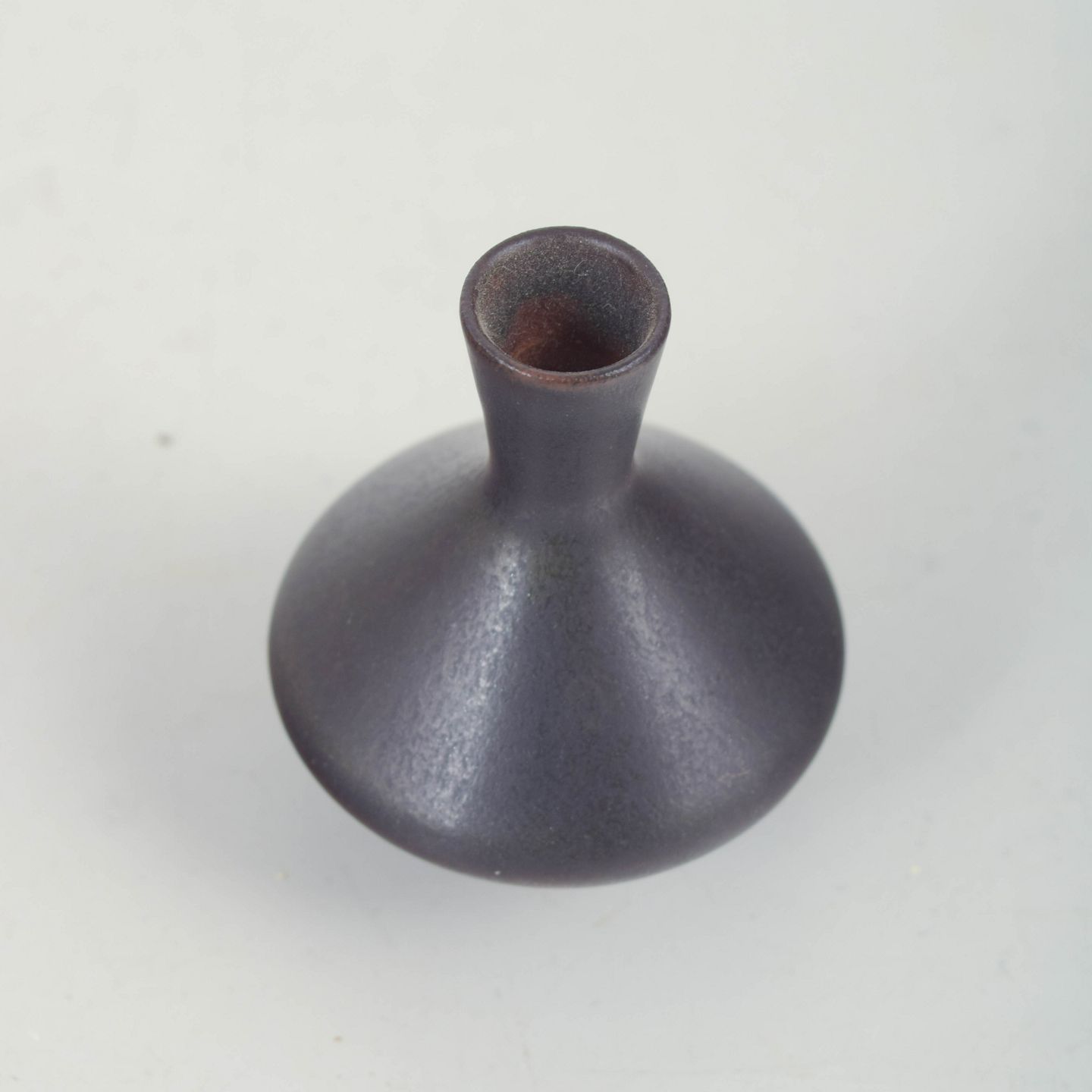 Miniature stoneware vase with a matte dark violet-grey glaze, pronounced body and a narrow, elongated neck.
