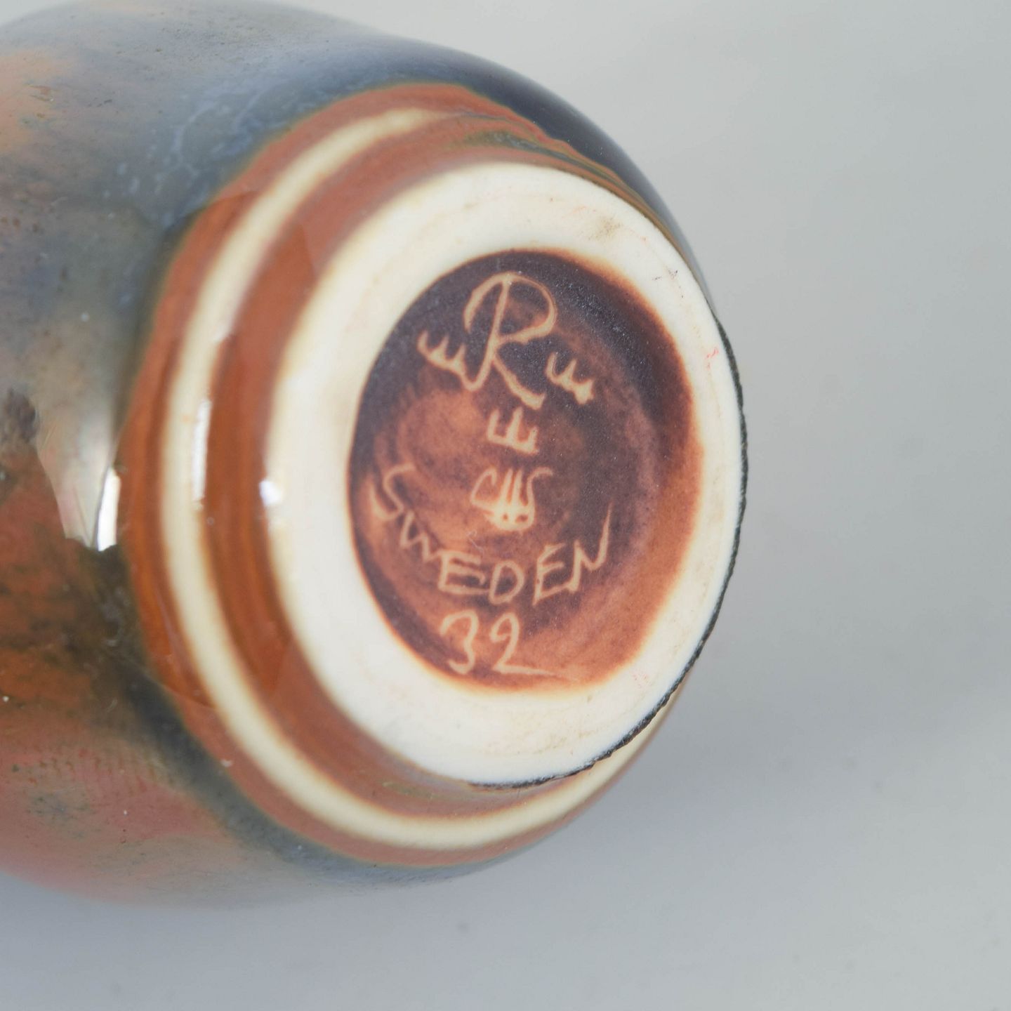 Miniature stoneware vase with a glossy glaze in deep blue-grey and warm brown tones, baluster-shaped body and narrow neck. Base stamped Rörstrand, Sweden.