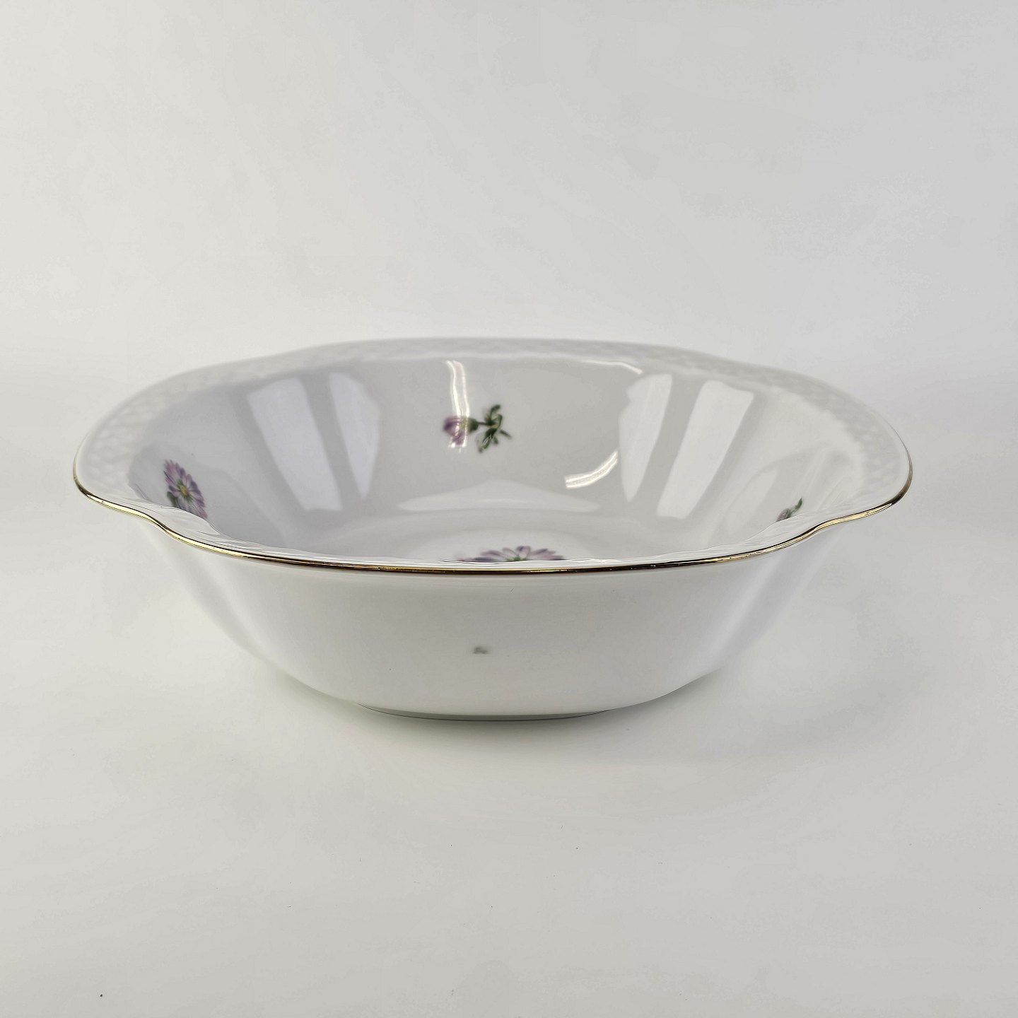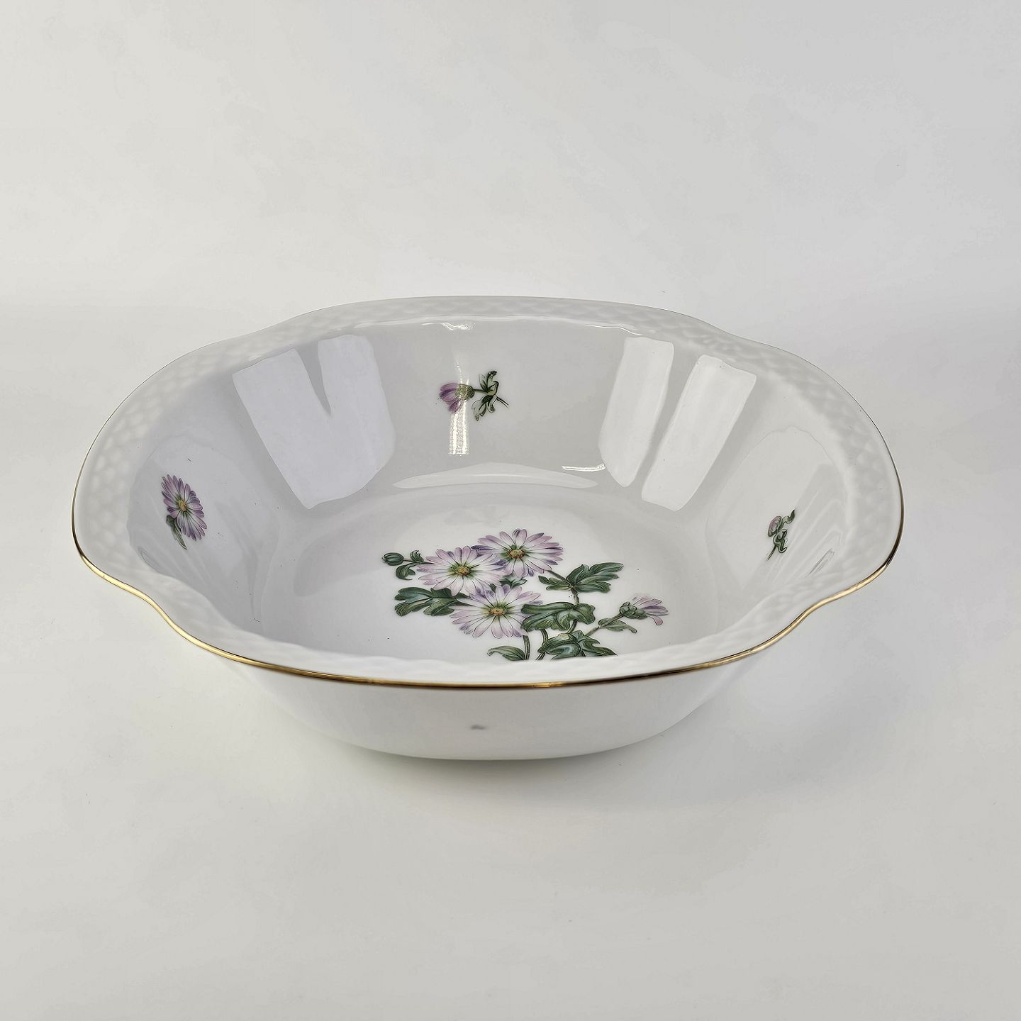 Krysantemum er hvidt porcelæn dekoreret med lys lilla blomst, grønne blade og guldkant.