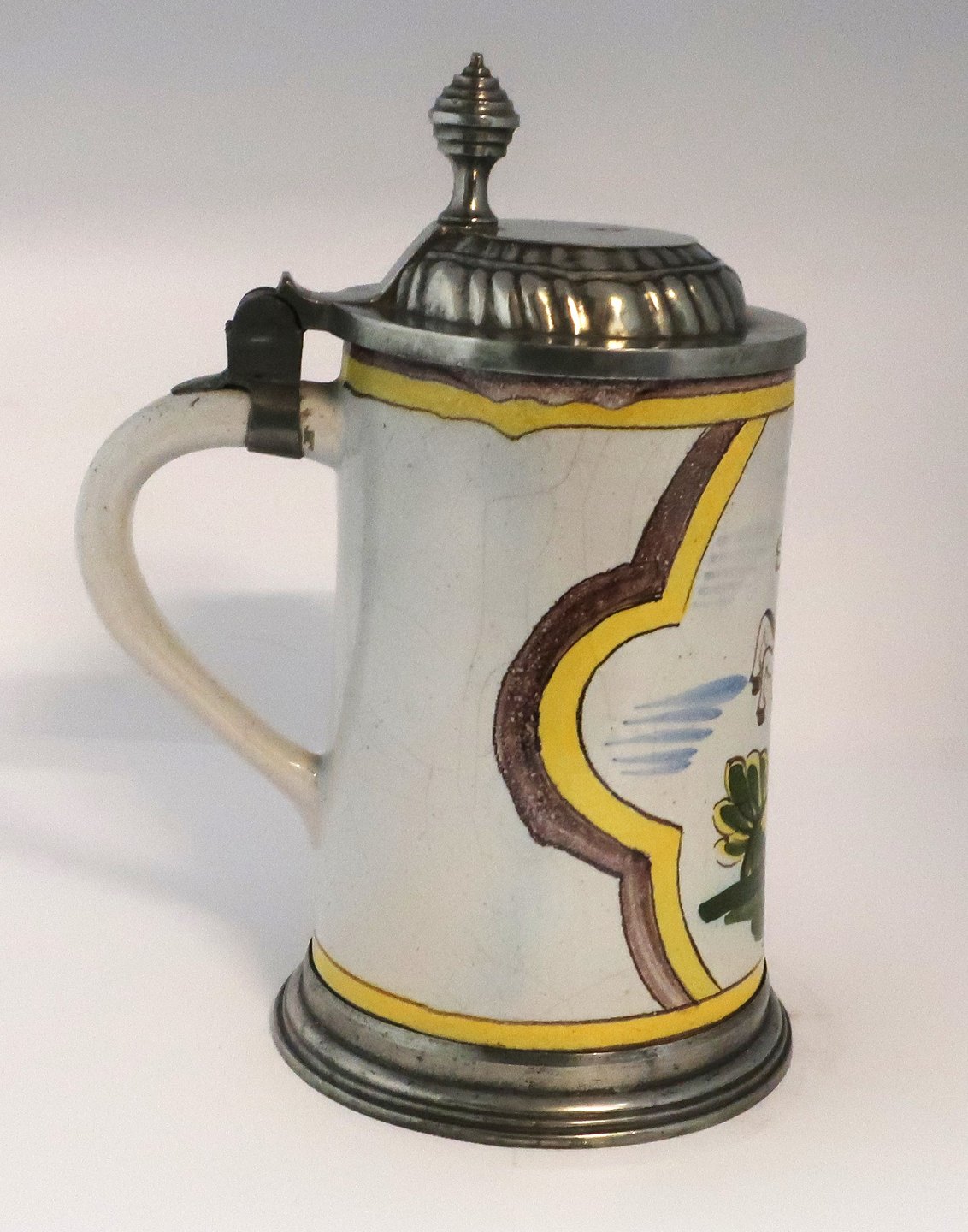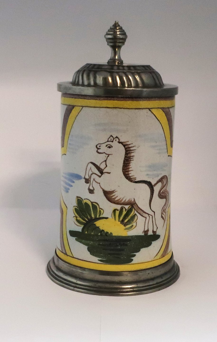 Kellinghusen. Earthenware mug with pewter lid. Decorated with a jumping horse. Height 23 cm
