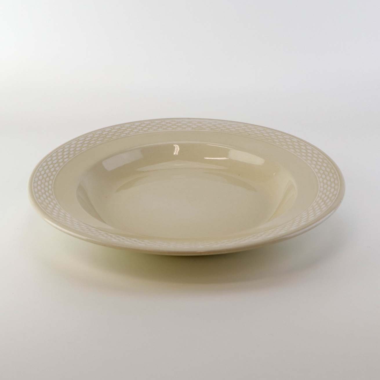 Sandfarvet fajancestel i stelform Viktoria II - Fletværk med dekoration af hvidt flet på gullig baggrund.