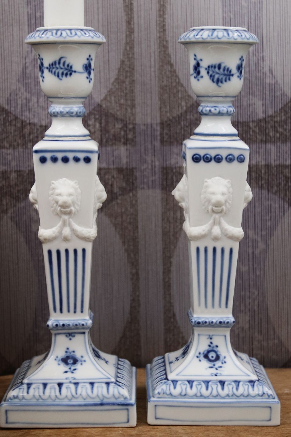 A pair of Royal Copenhagen Blue Fluted Fluted candlesticks "lion candlesticks"...