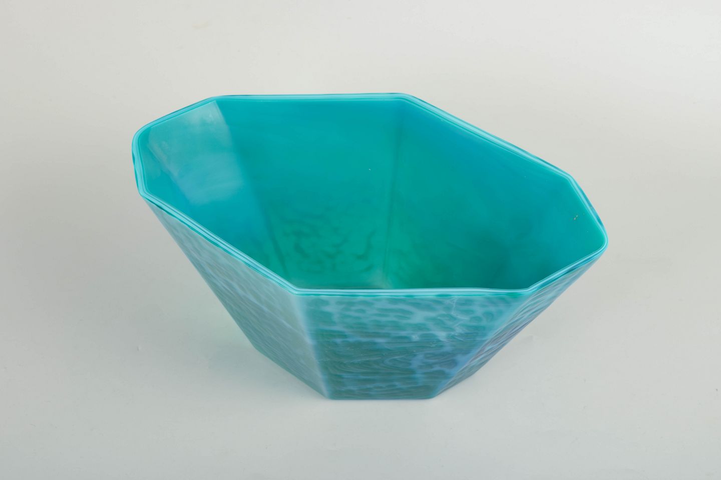 Large octagonal bowl in thick art glass with vibrant turquoise tones and a marbled surface structure. Produced by Pukeberg Glasbruk and retaining the original sticker.