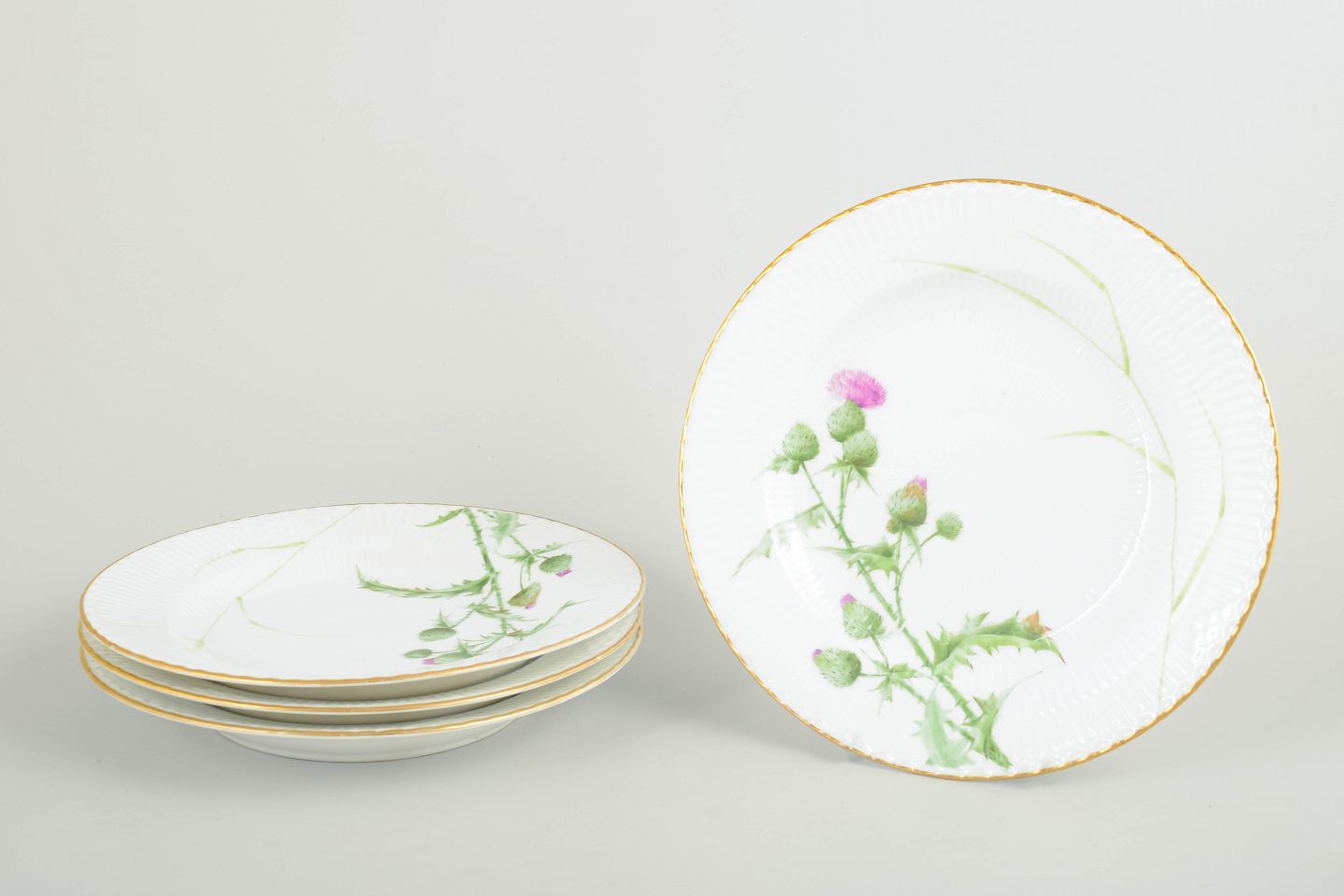 Set of four hand-painted porcelain dinner plates from the Thistle series. Decorated with a naturalistic thistle motif in green and pink tones with a gilt rim. First factory quality.