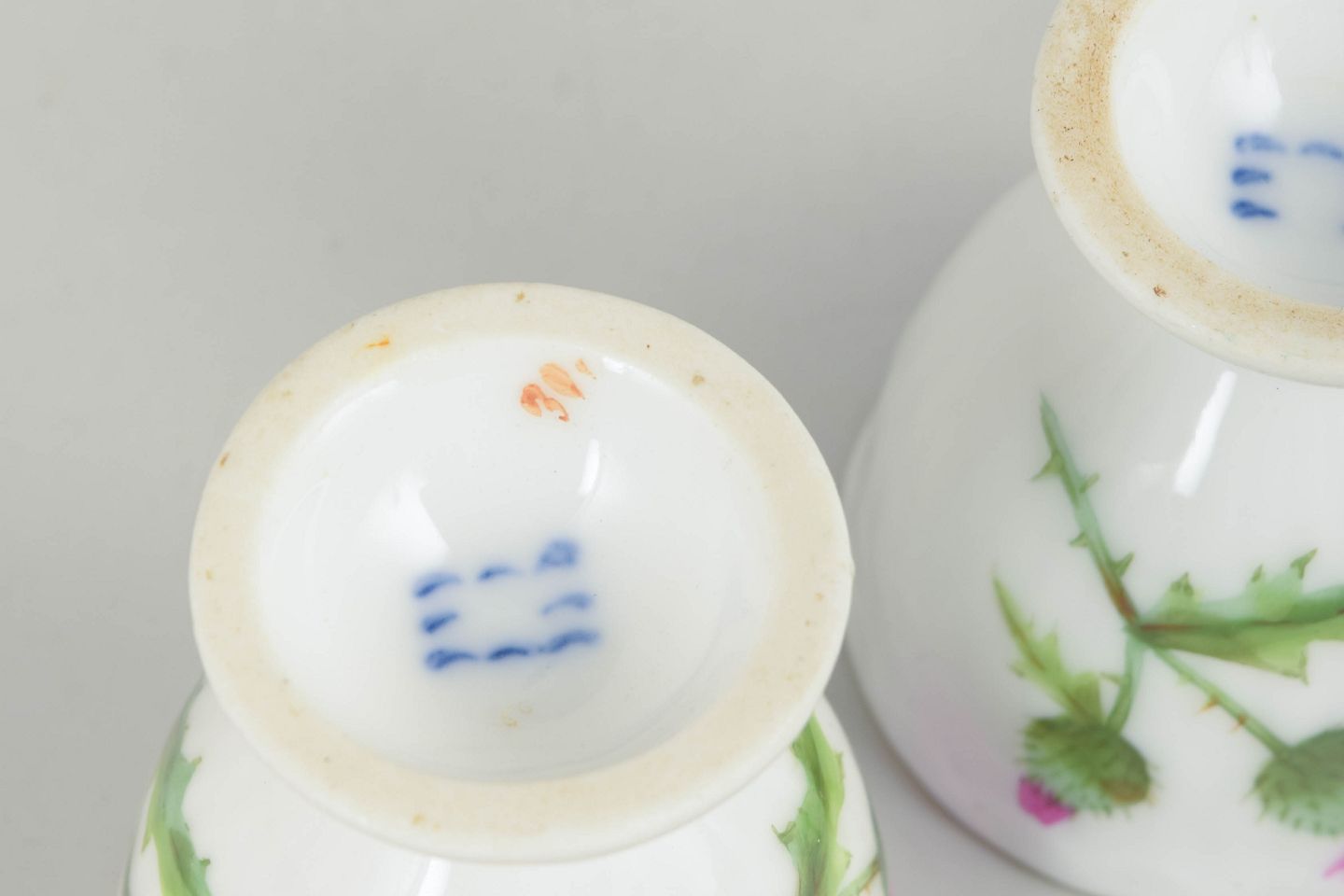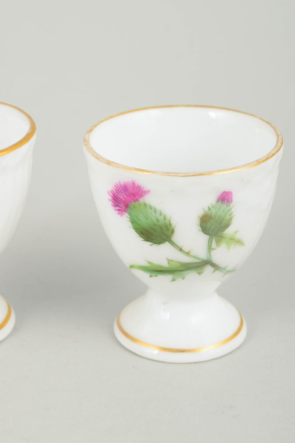 Two hand-painted porcelain egg cups from the Thistle series. Decorated with a thistle motif in green and pink tones with a gilt rim. First factory quality.