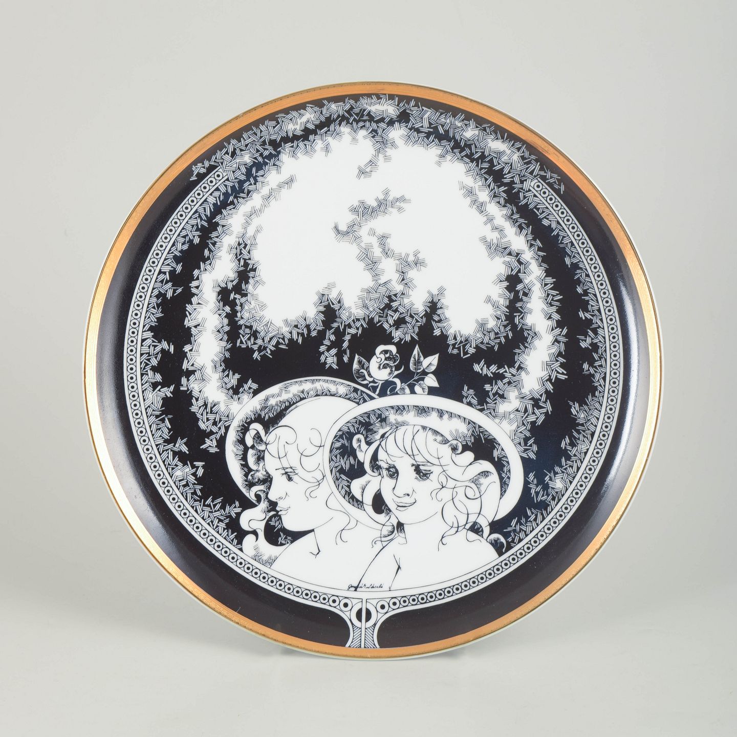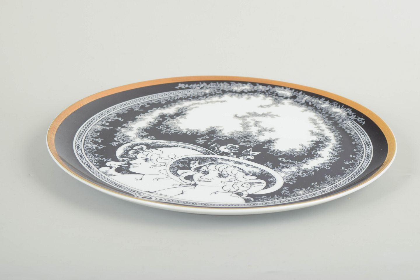 Large round dish in white glazed porcelain with black decorative border and figural motif on the lid. Produced by the Hollóháza Porcelain Manufactory.