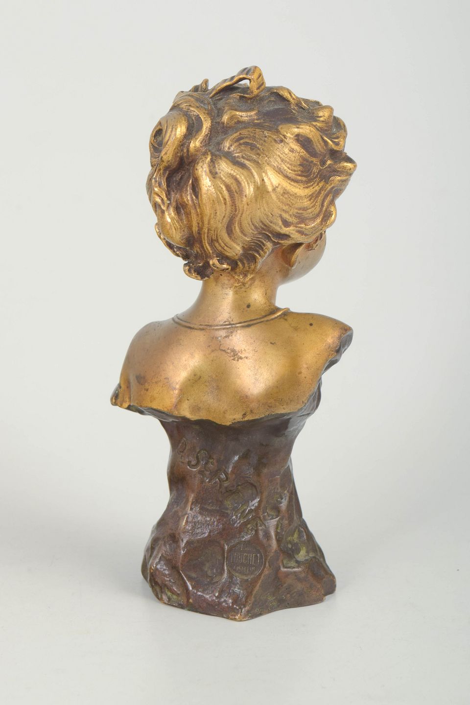 Figurative bust in solid bronze depicting a young girl with gently turned head and softly modelled facial features. Cast by Louchet, Paris, in the 1890s.