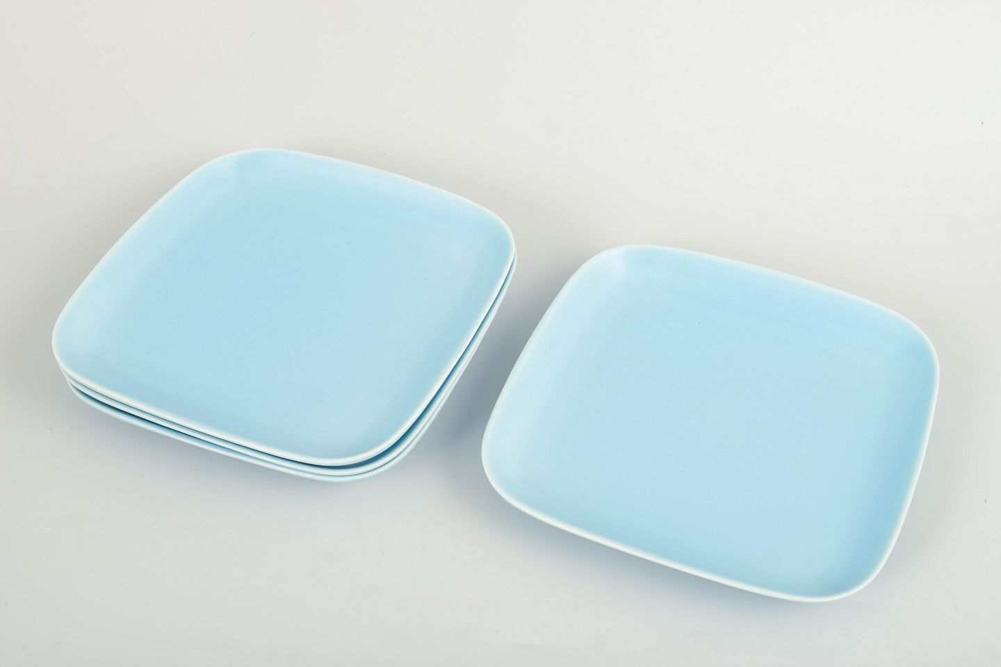 Square dinner plates in stoneware with rounded corners and an even turquoise glaze.
