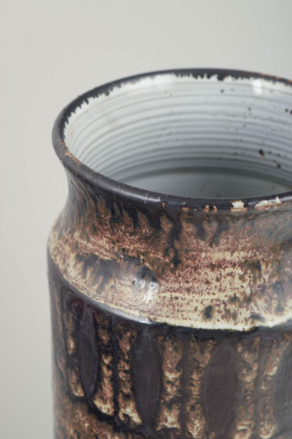 Cylindrical stoneware vase with a slightly constricted neck and defined rim. The surface features deep brown and black tones with a metallic sheen and pronounced vertical and horizontal glaze effects.