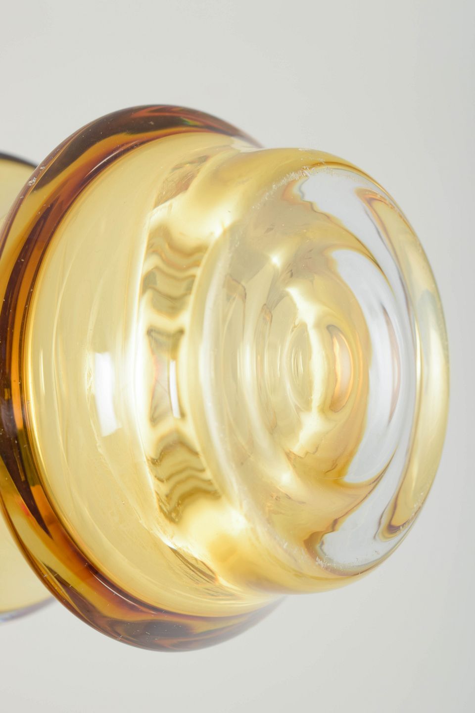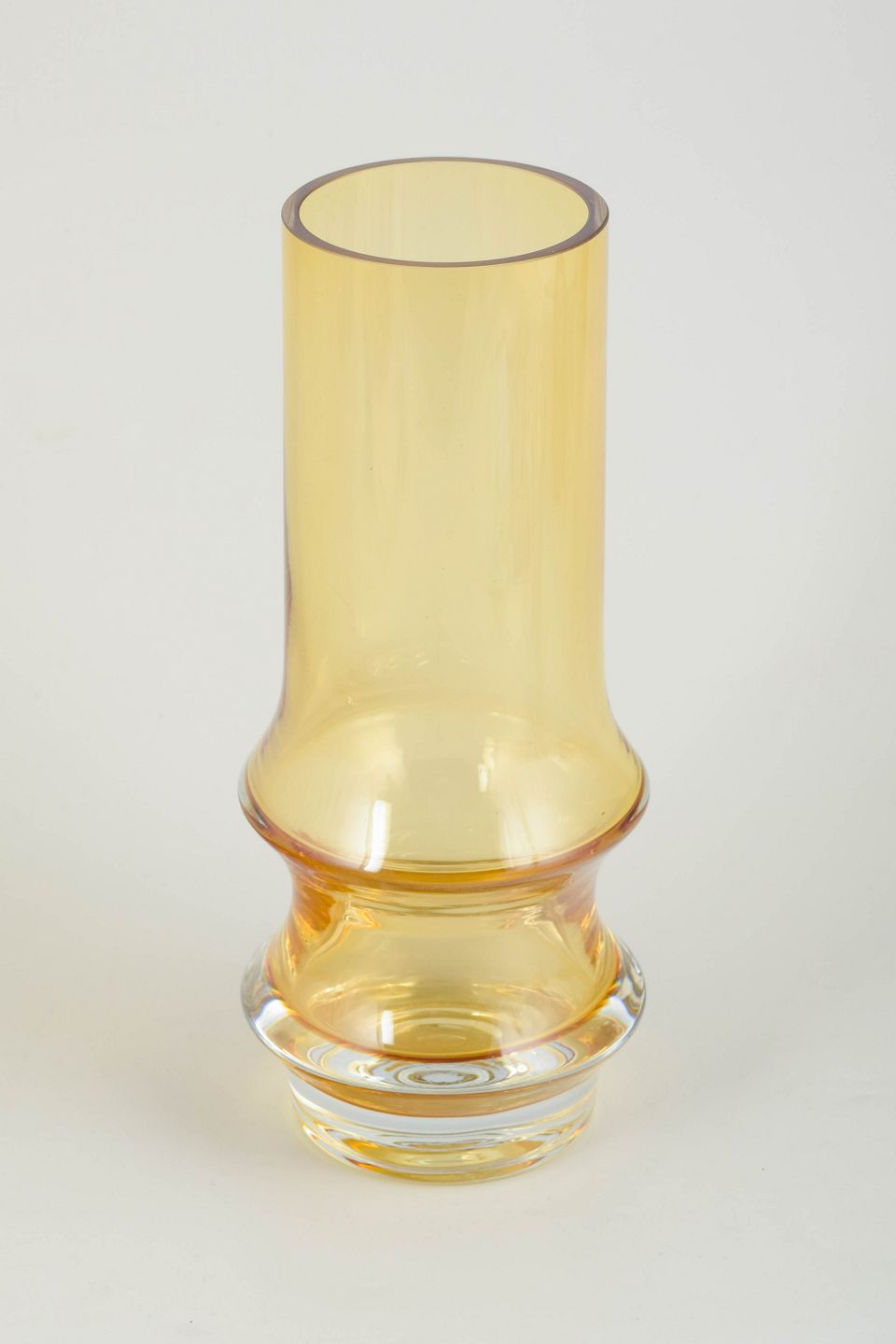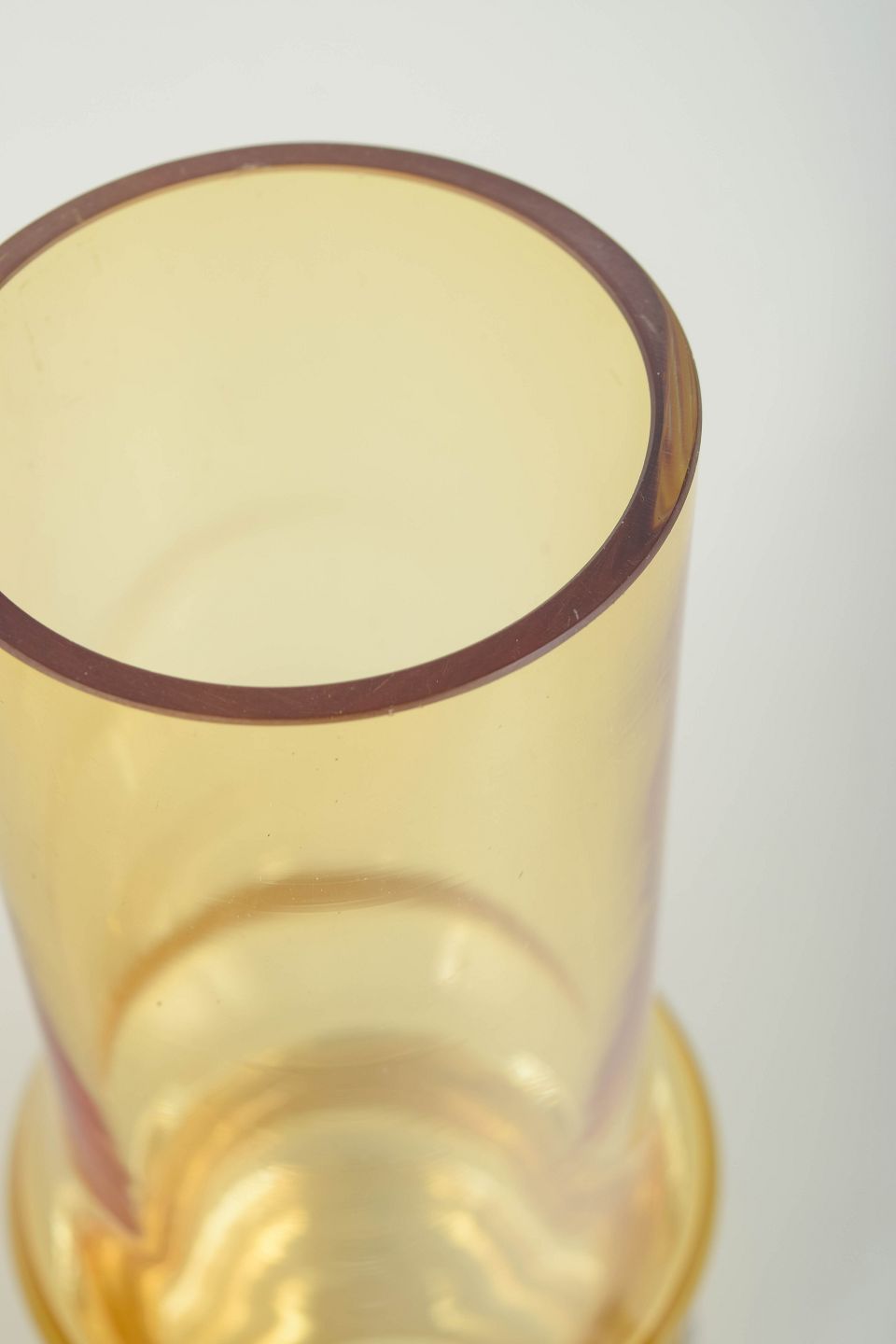 Tall cylindrical vase in amber art glass with slightly flared rim and a pronounced profiled base. Executed in mouth-blown glass with a warm golden tone and a solid clear foot. Unsigned.