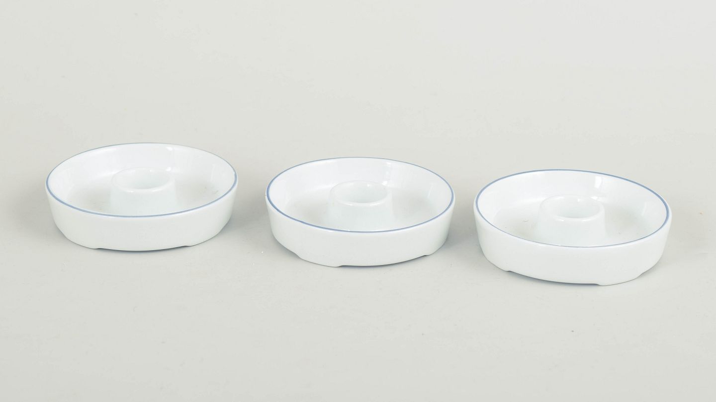 Three small round candlesticks in white glazed porcelain with a simple blue line along the rim. The design forms part of the Blue Line series and reflects the strict functionalist aesthetic of the 1970s. Unmarked.