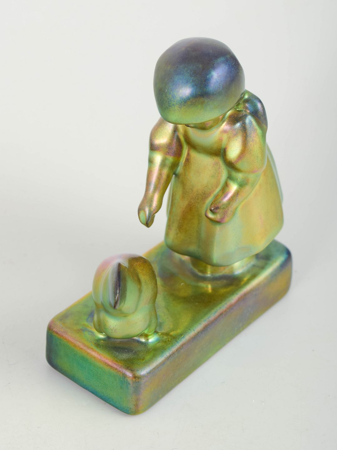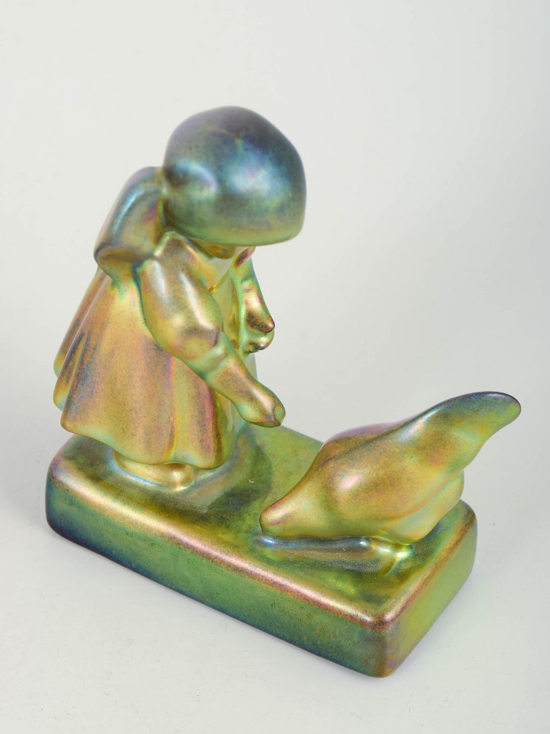 Decorative figural group in stoneware with iridescent eosin glaze in green and golden tones. The motif depicts a girl standing before a chicken on a rectangular base, designed in a stylised Art Deco manner.