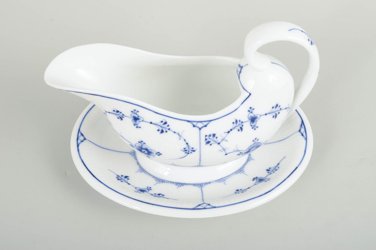 Rare antique sauce boat in hand-painted porcelain from the Blue Fluted Plain service with classic underglaze decoration in cobalt blue. Model 1/201. With fixed integrated stand made as one piece with the sauce boat. First factory quality. Produced in the 1890s.