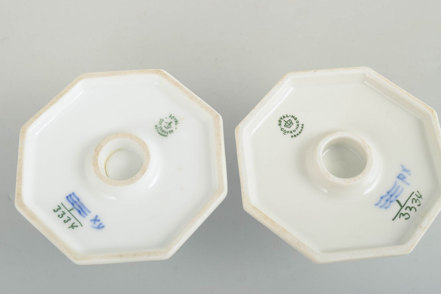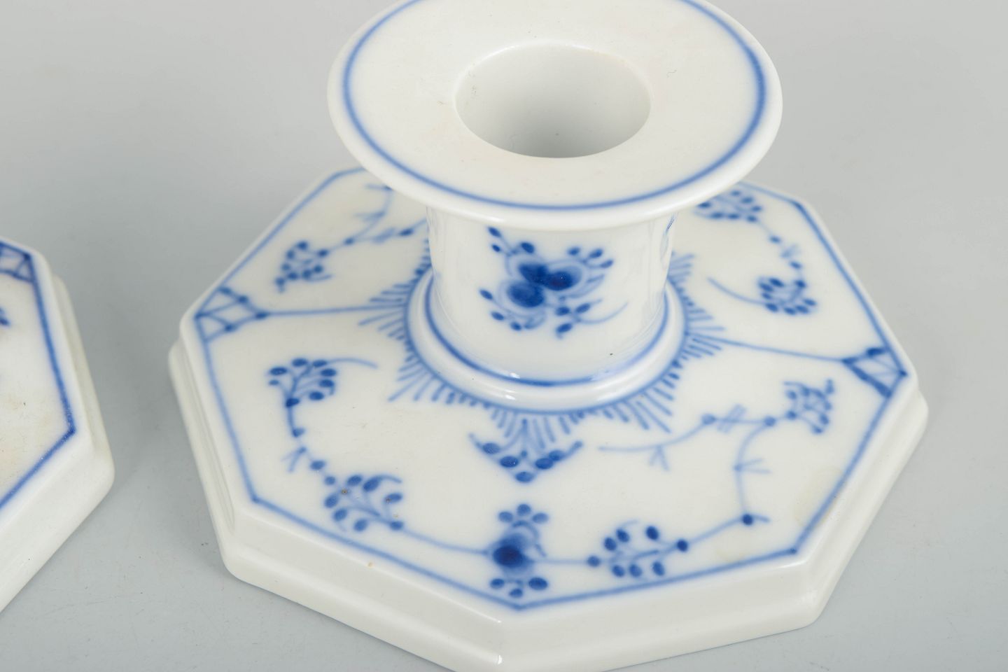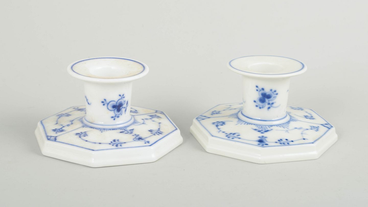 Pair of hand-painted porcelain candlesticks from the Blue Fluted Plain service with classic underglaze decoration in cobalt blue. Model 1/3334. One is first factory quality, the other cancelled with one incised line to the base. Produced in 1963.