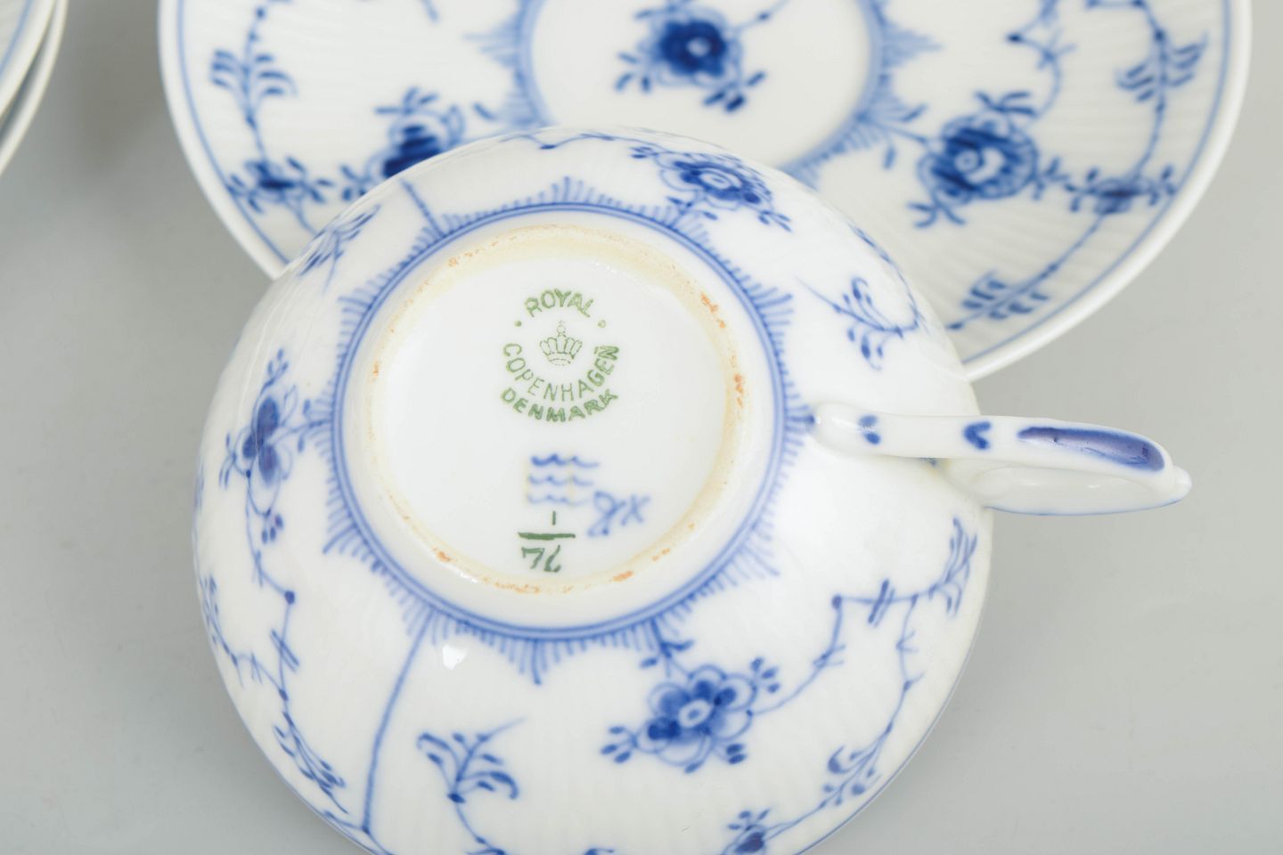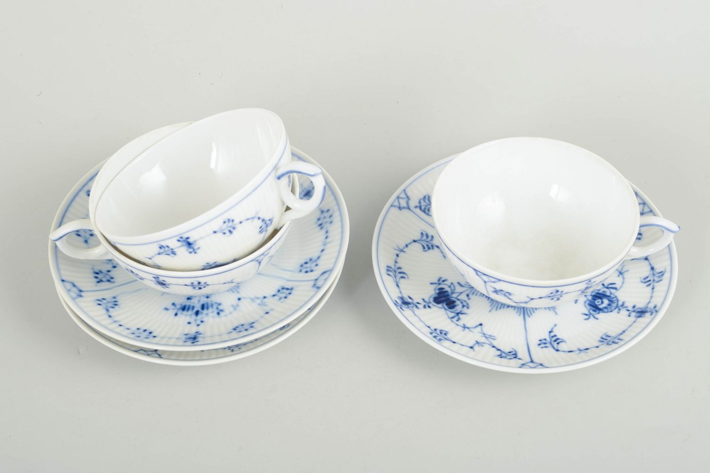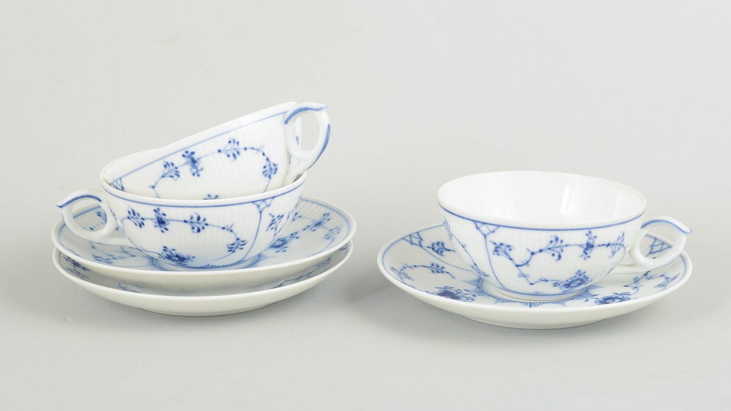 Set of three hand-painted porcelain tea cups from the Blue Fluted Plain service with classic underglaze decoration in cobalt blue. Model 1/76. Some pieces are first factory quality, others cancelled with one or two incised lines to the base.