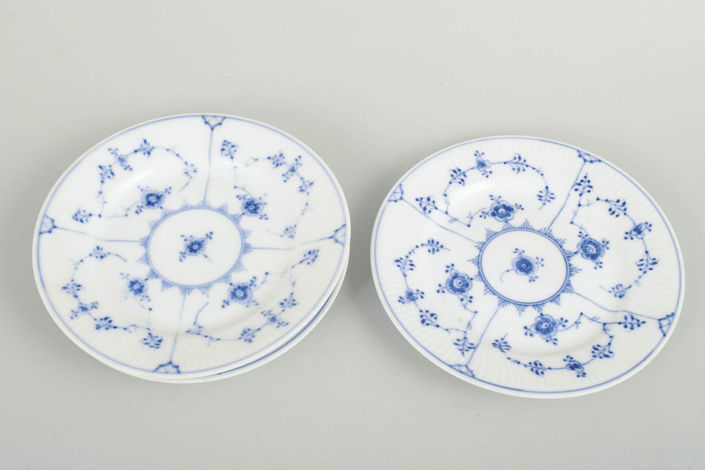 Set of three hand-painted porcelain cake plates from the Blue Fluted Plain service with classic underglaze decoration in cobalt blue. Model 1/181. Each plate measures 16 cm in diameter. Cancelled with one incised line to the base. Produced in 1950.