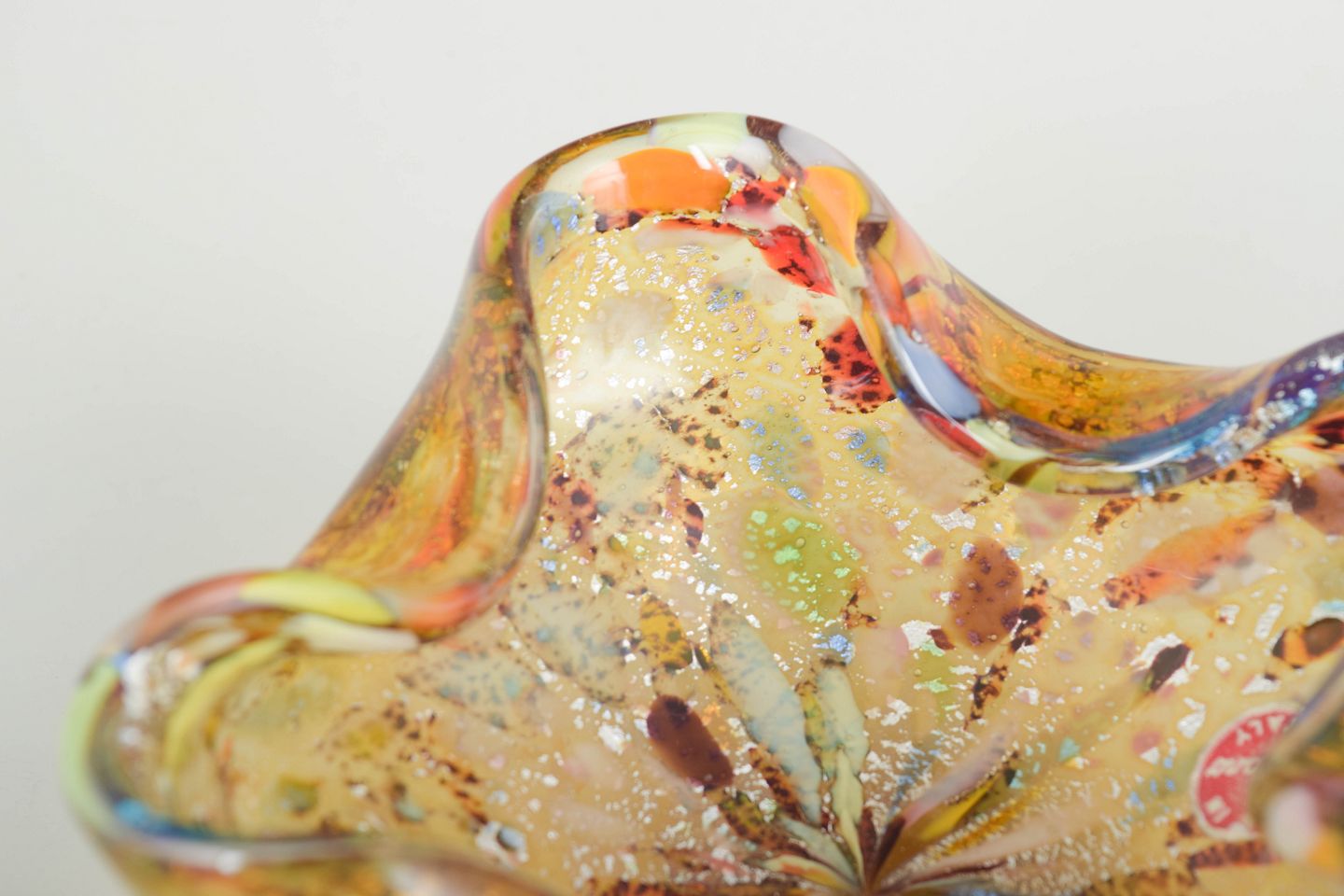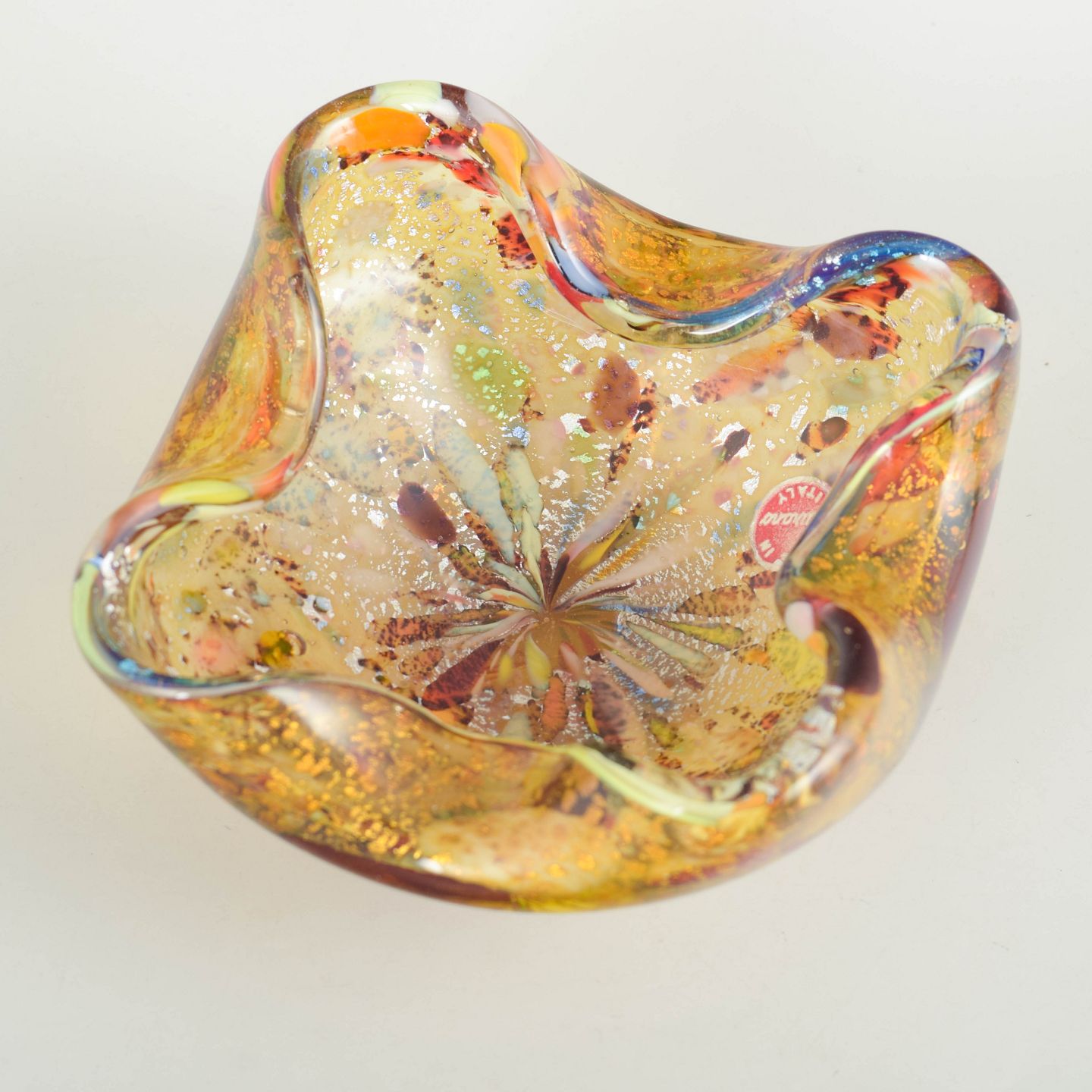 Organically shaped bowl in hand-blown glass with undulating rim. Executed in golden and amber tones in aventurine techniques, and multicoloured elements. Original sticker preserved. Produced on Murano in the 1960s/70s.