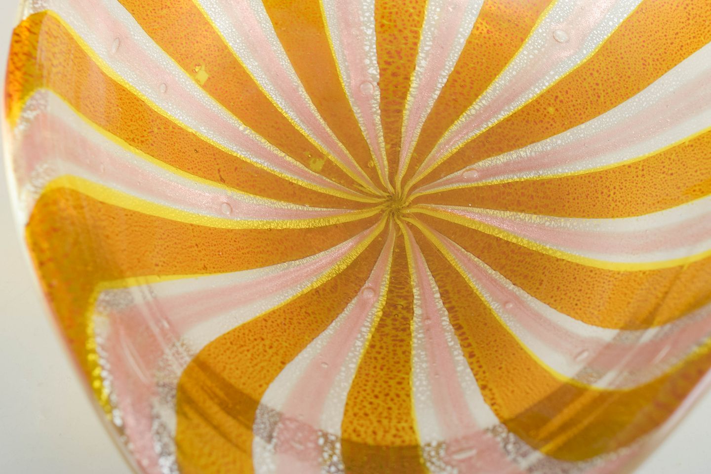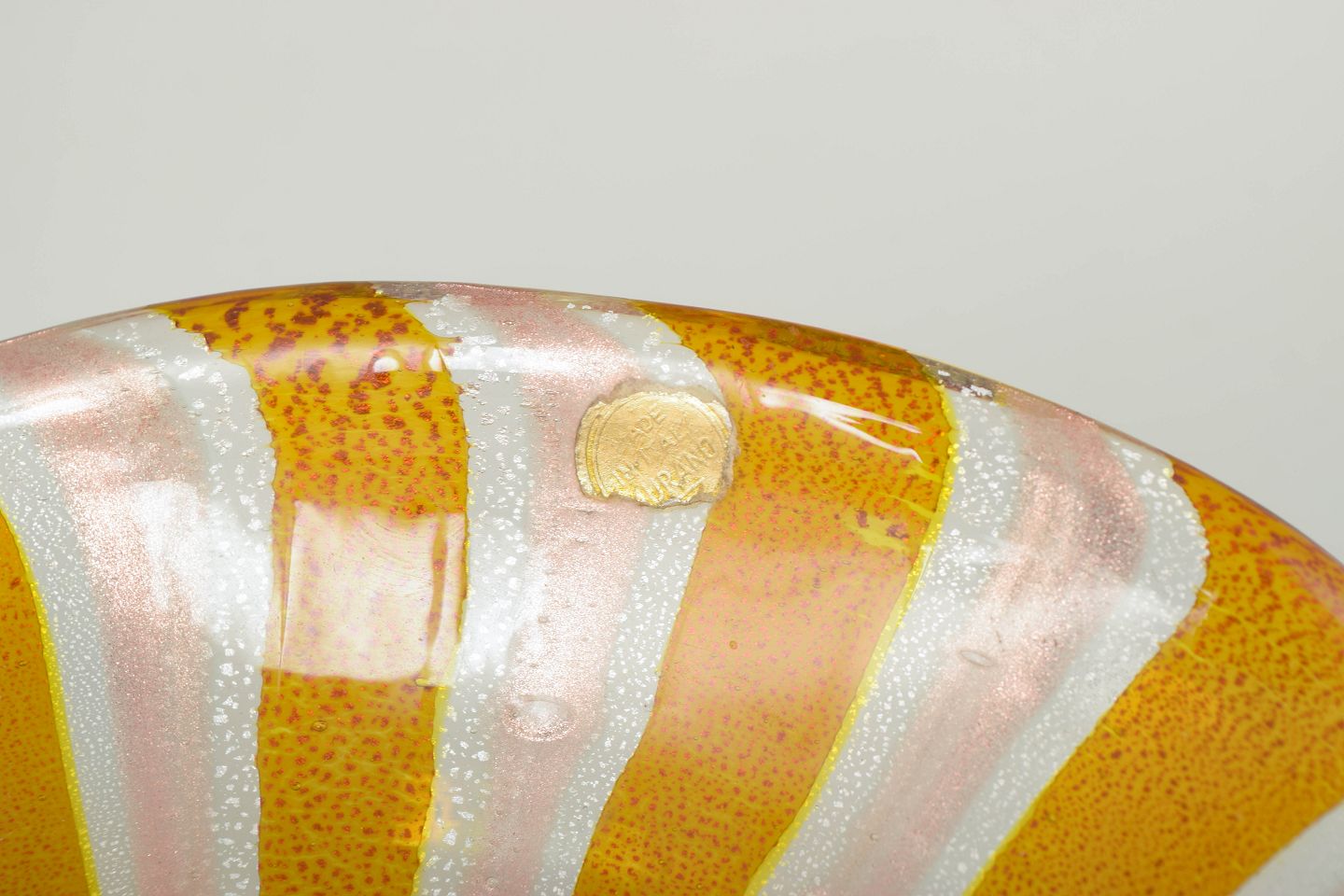 Organically shaped bowl in hand-blown glass with twisted rim. Executed in warm yellow and white stripes, aventurine technique, and iridescent effect. Original sticker preserved. Produced on Murano in the 1960s/70s.