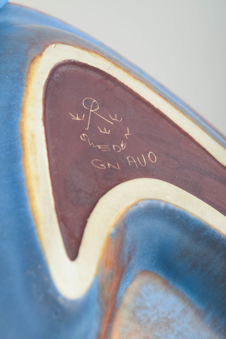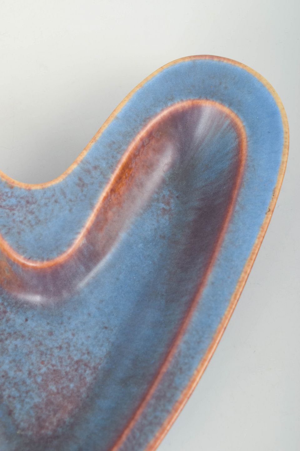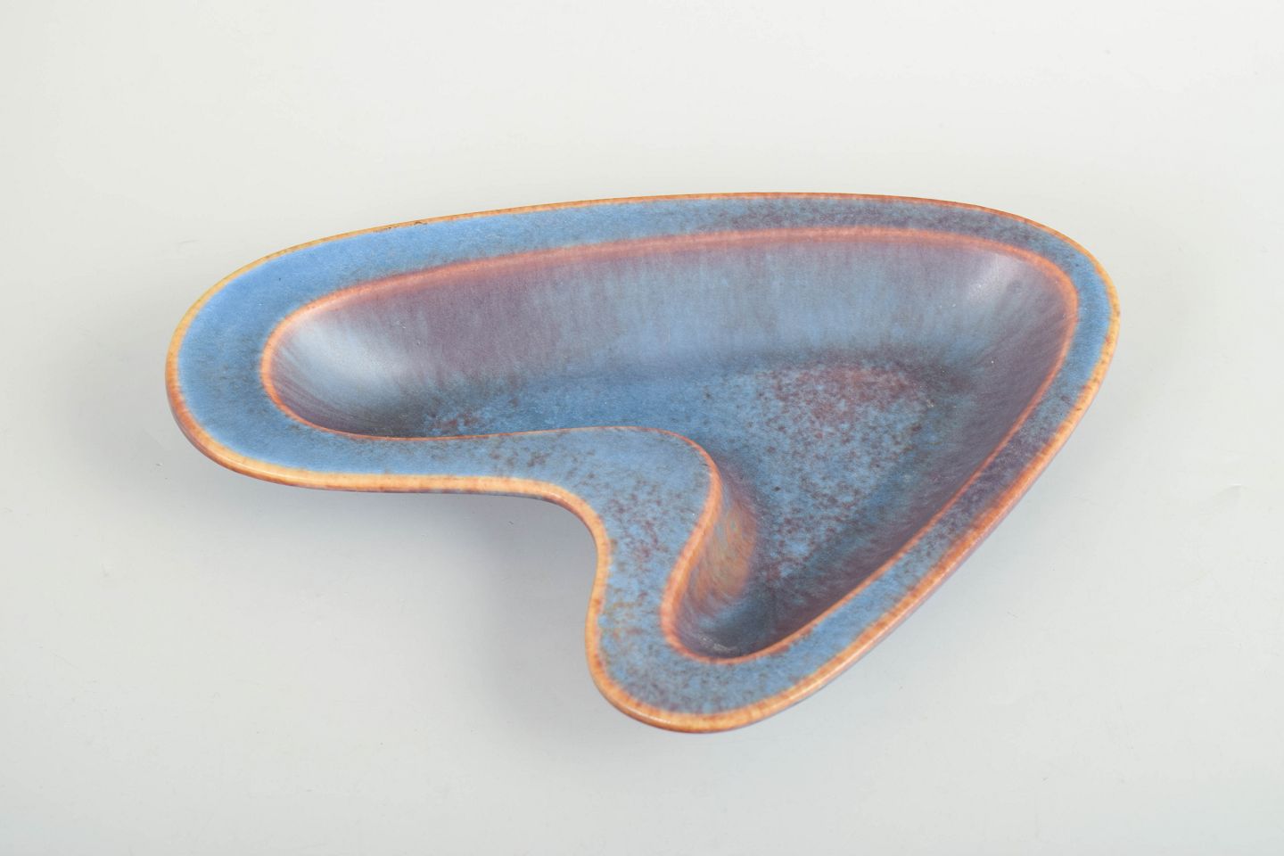 Organically shaped stoneware bowl with an asymmetrical, free-form silhouette. Decorated with a blue and violet glaze with a warm-toned rim, characteristic of Gunnar Nylund’s experimental glazes at Rörstrand in the mid-20th century. First factory quality.