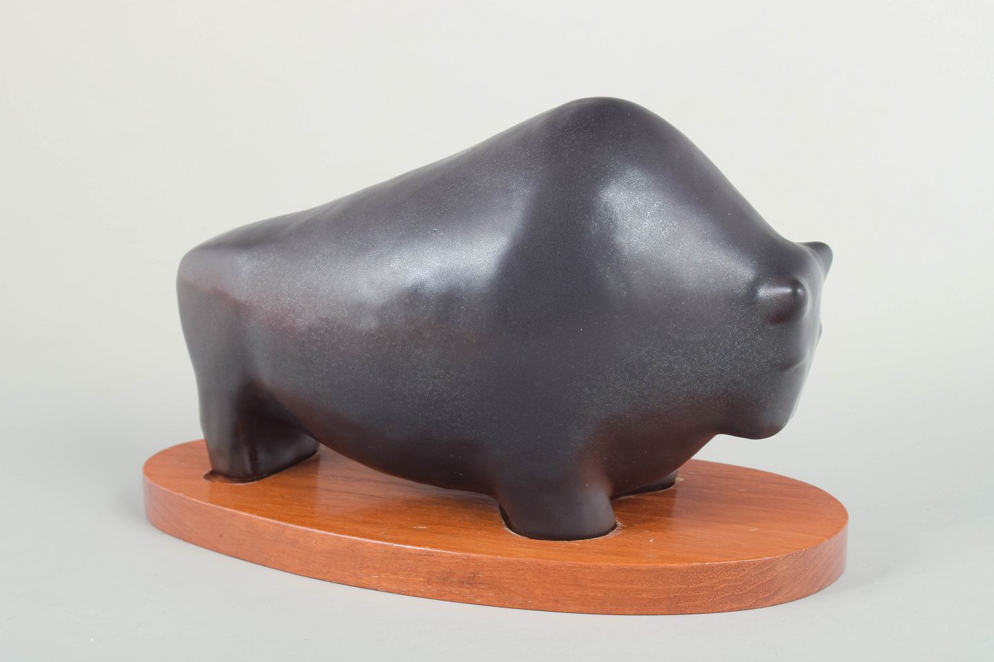 Lillemor Petersson for Rörstrand, bull figure on wooden stand.