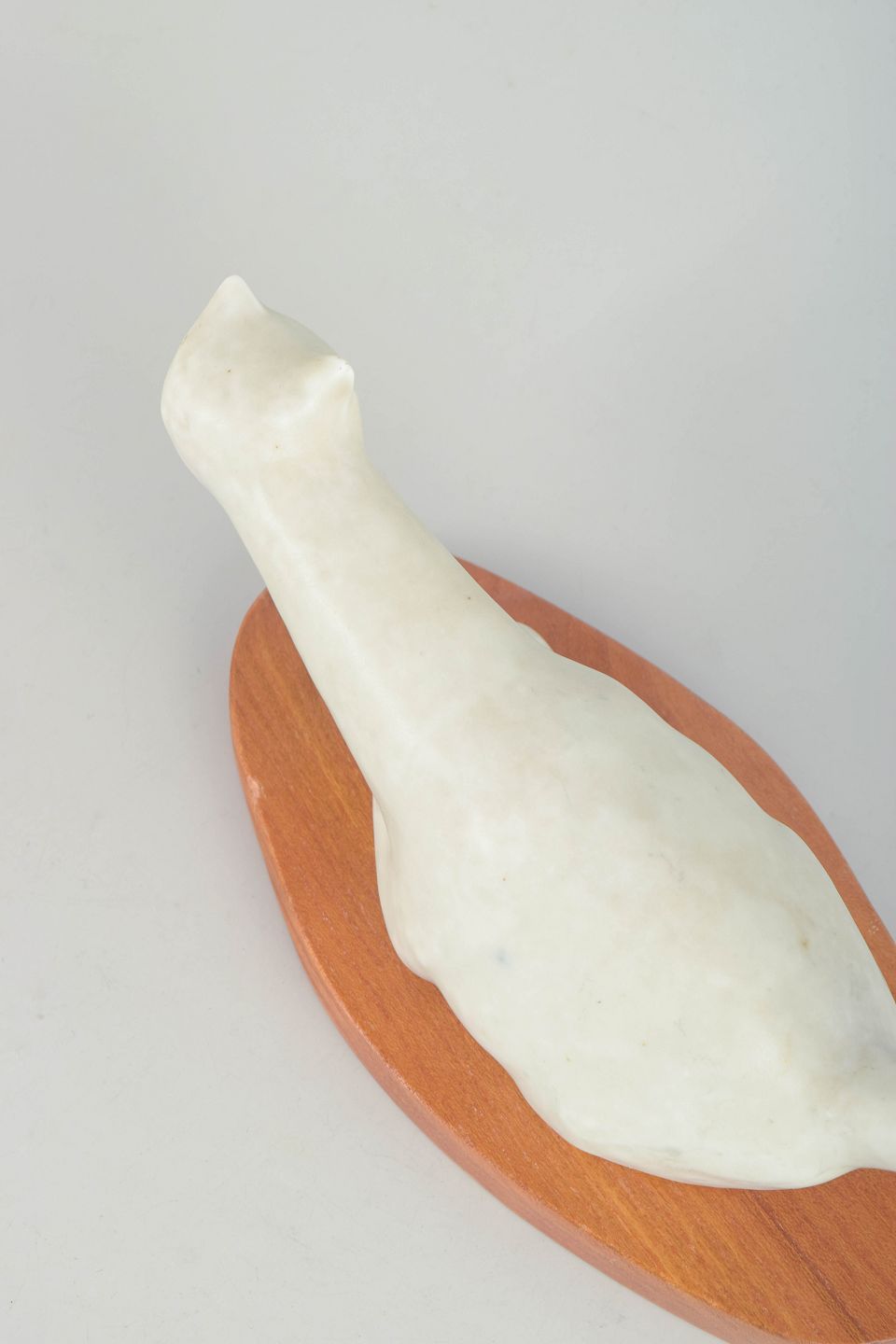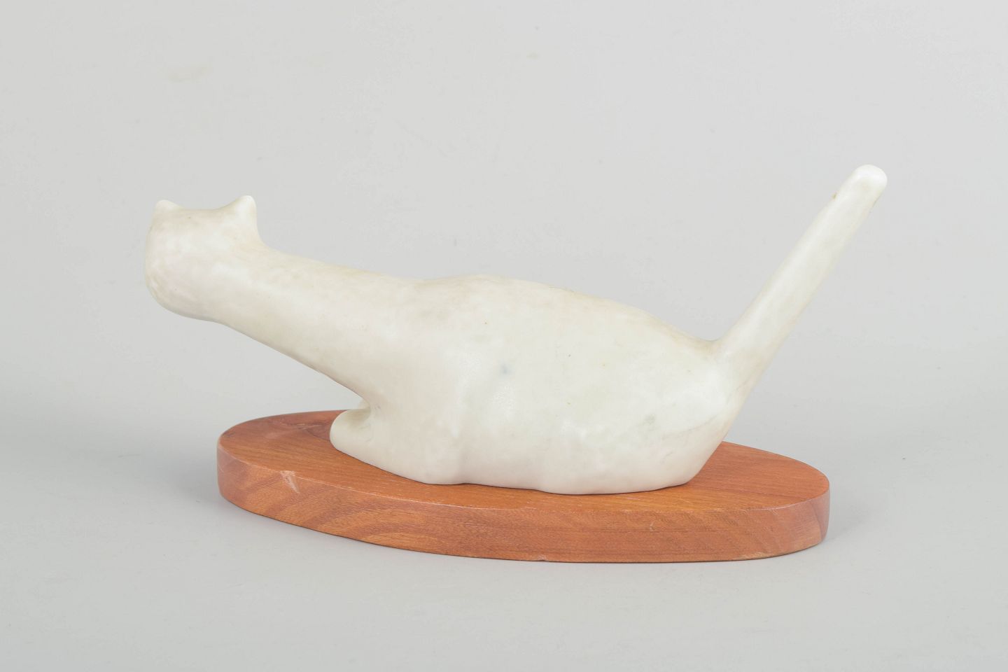 Naturalistically shaped cat in white stoneware with an elongated, stylised body and raised tail. The figure is standing on an oval wooden base and displays a restrained modernist design characteristic of Rörstrand’s mid-twentieth-century production. Factory mark cancelled with one incised line.