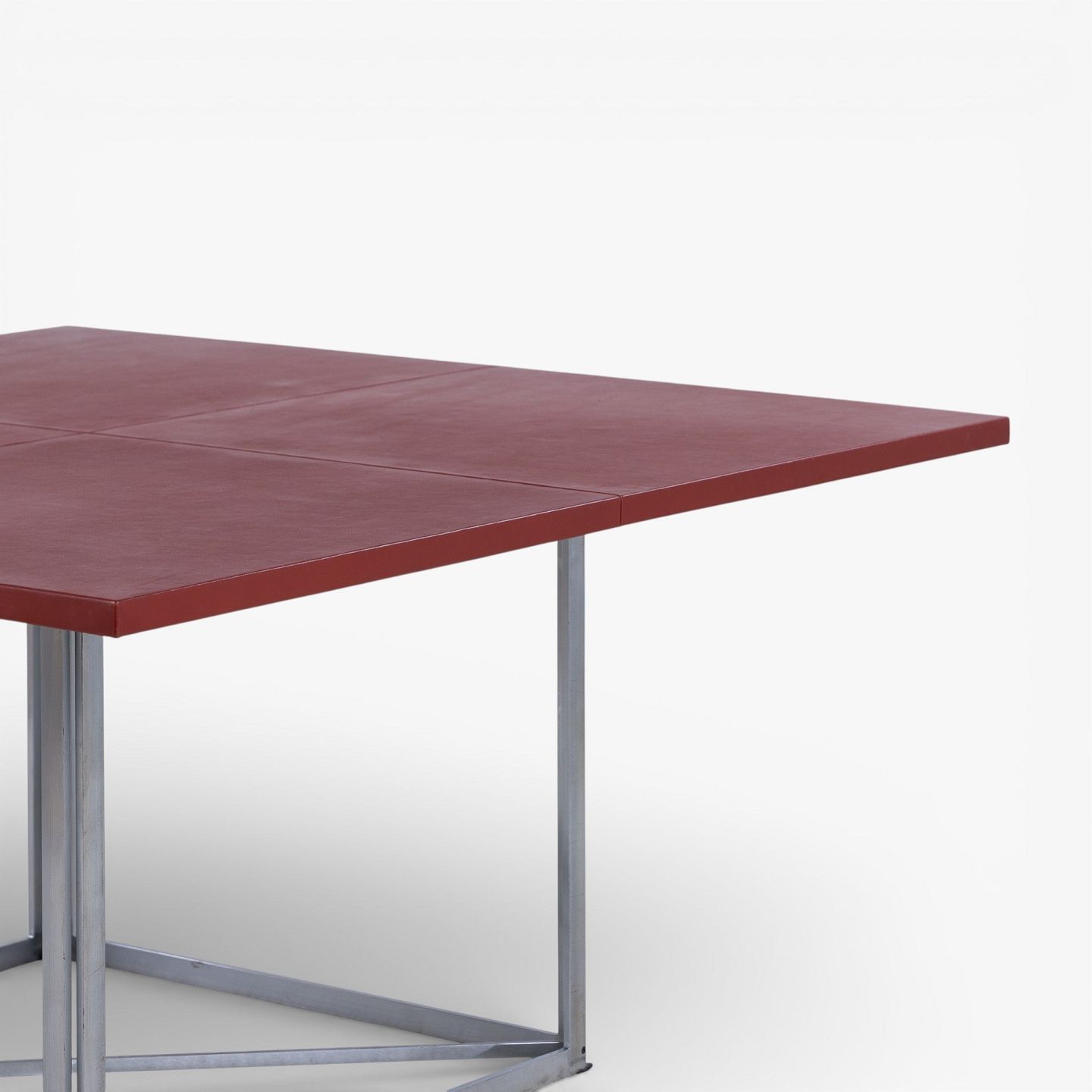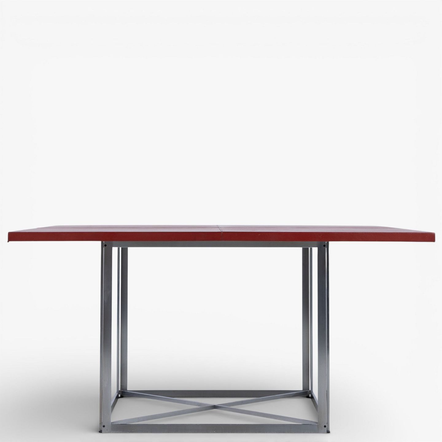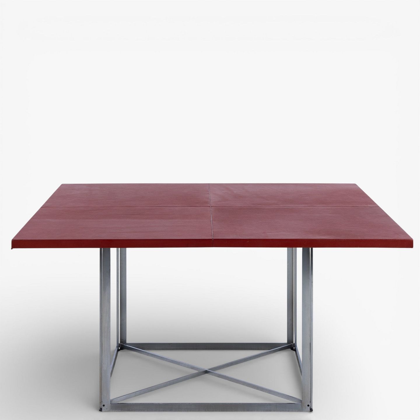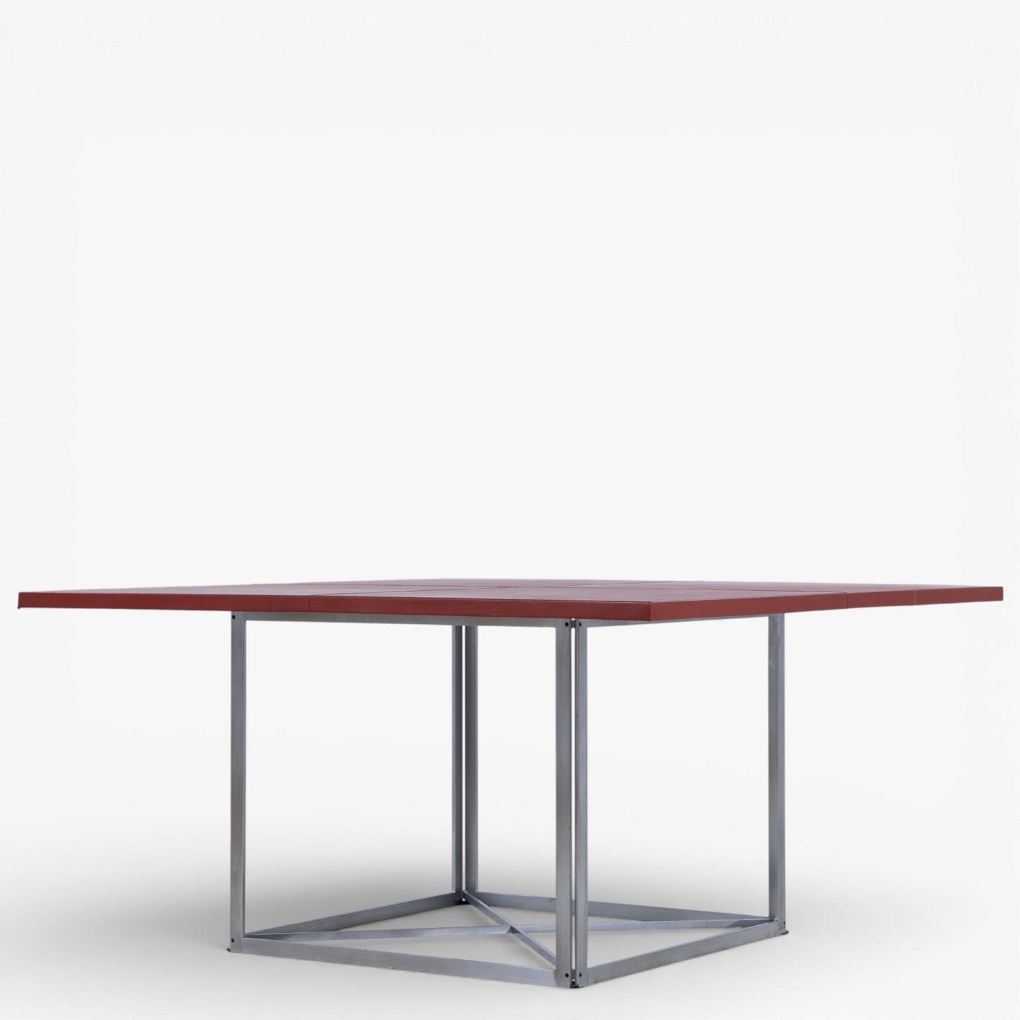 PK 40 - Square dining table with red leather top on steel frame. Manufacturer's mark.