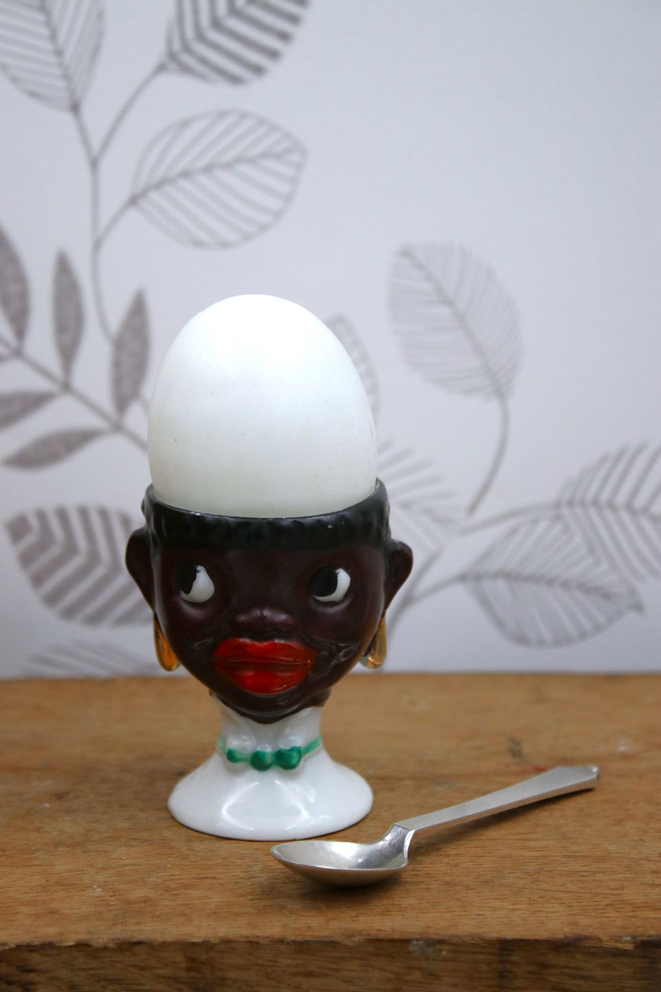 Old egg cup from the 1930s in porcelain with a painted funny face.