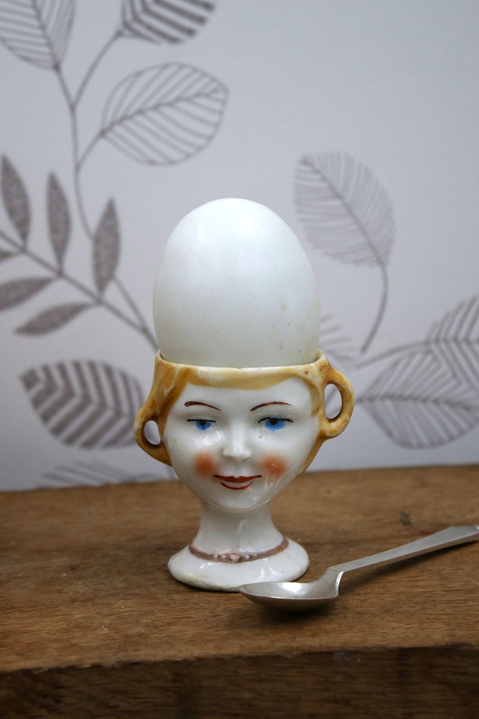 Old egg cup from the 1930s in porcelain with a painted funny face.