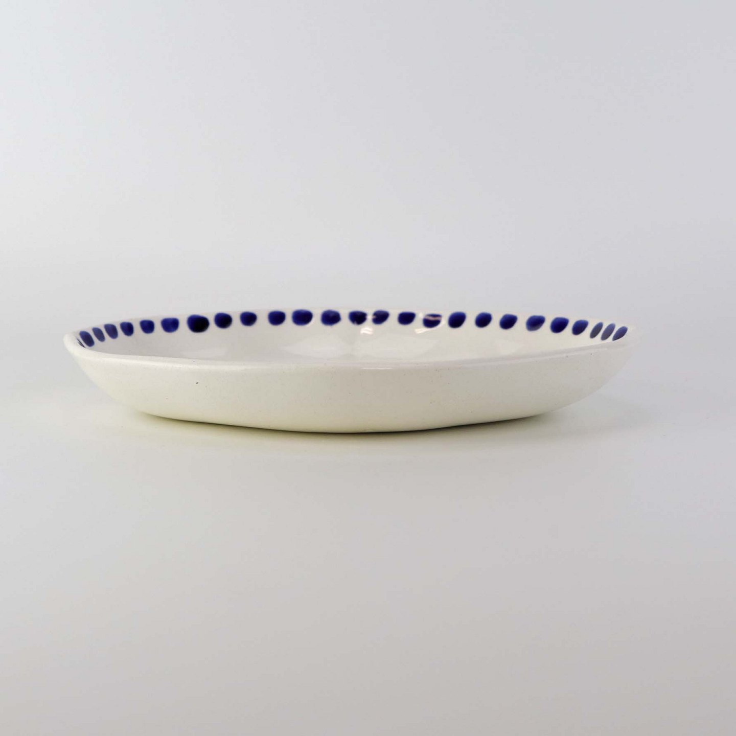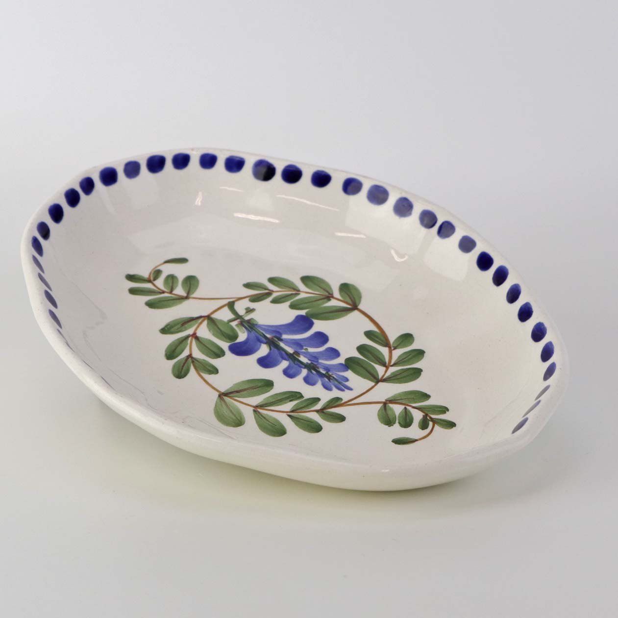 Lille ovalt fad med bølget form i fajance fra stellet Blåregn. Stellet er fremstillet i perioden år 1903-1933. Nr. 522/354