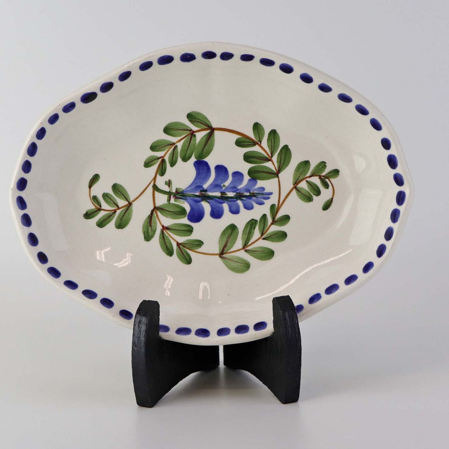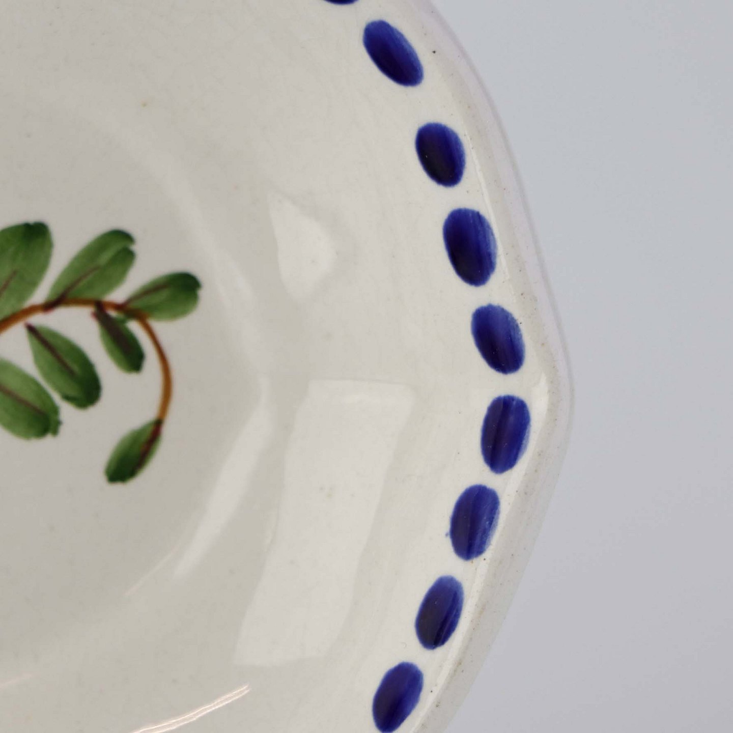 Fajancestel med dekoration af ranker af blåregn og blade på lys baggrund afsluttet med kant af runde blå pletter.