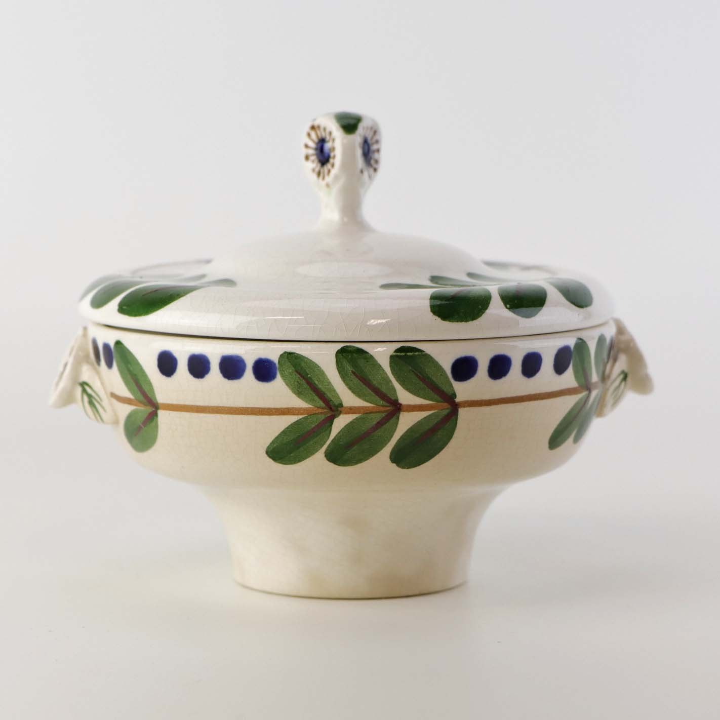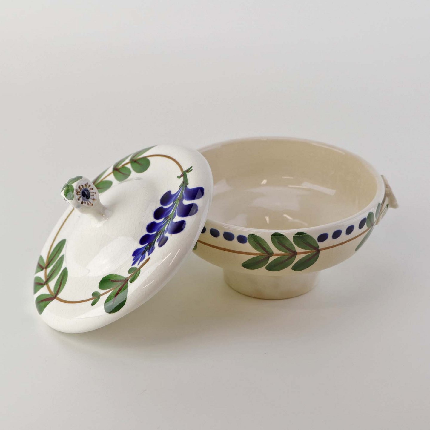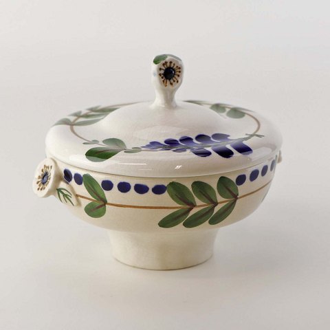 Lågkrukke til sukker i fajance fra stellet Blåregn. Stellet er fremstillet i perioden år 1903-1933. Nr. 522/432