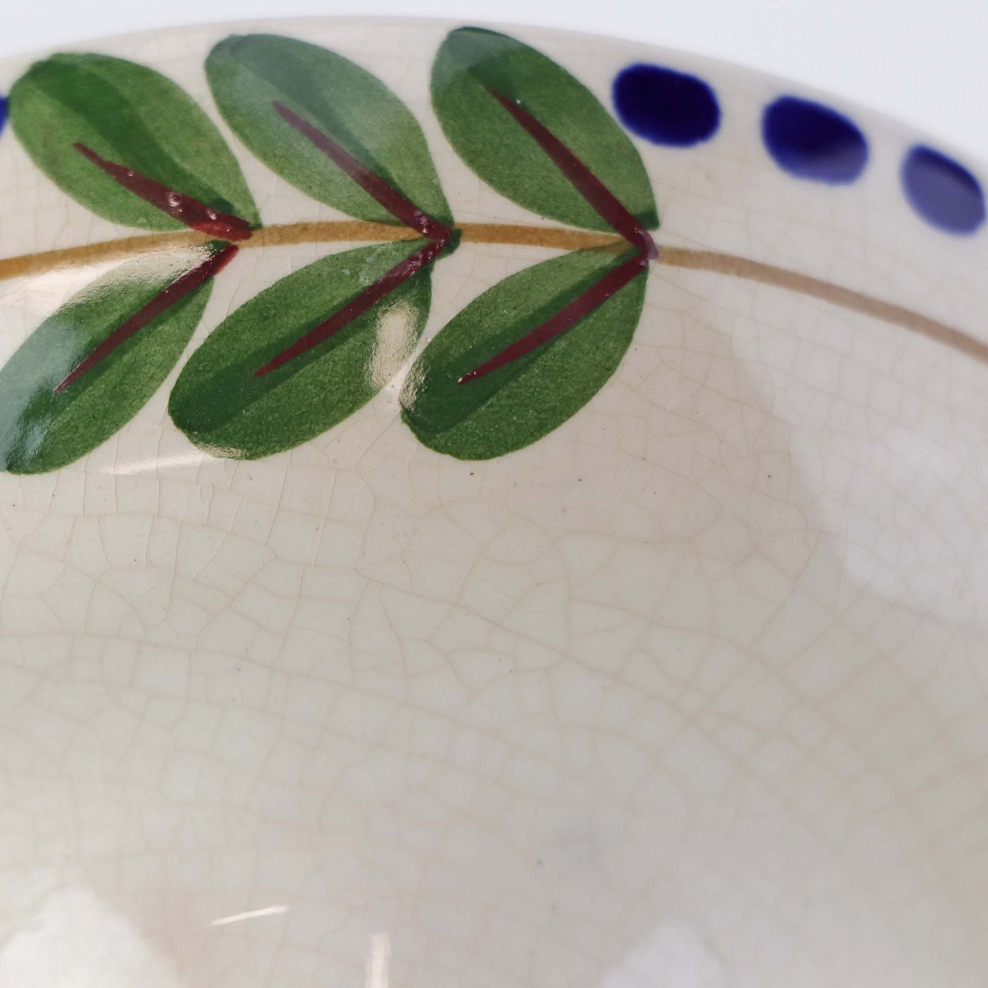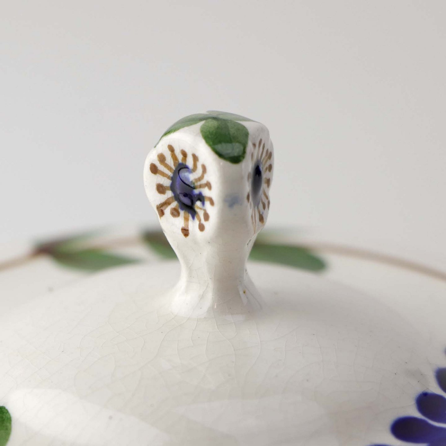 Fajancestel med dekoration af ranker af blåregn og blade på lys baggrund afsluttet med kant af runde blå pletter.