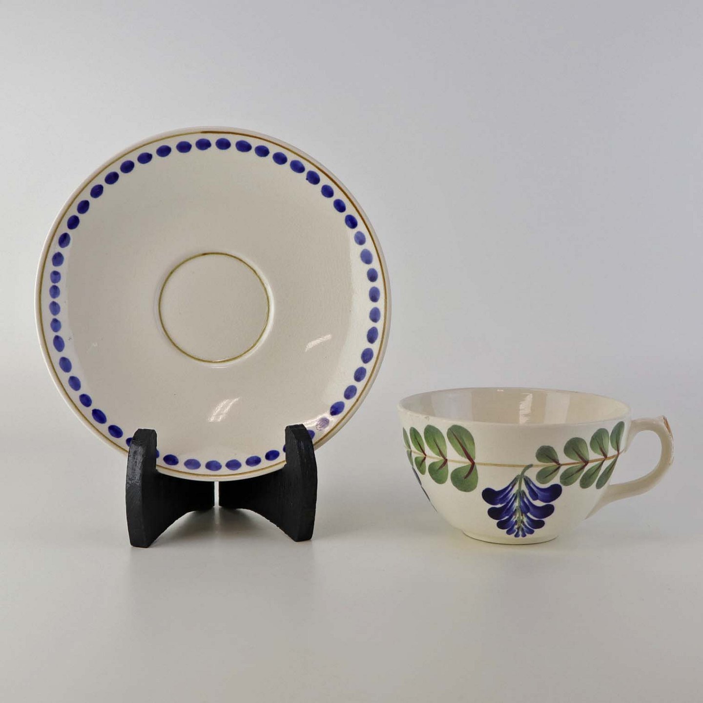 Tekop med underkop i fajance fra stellet Blåregn. Stellet er fremstillet i perioden år 1903-1933. Nr. 522/1756