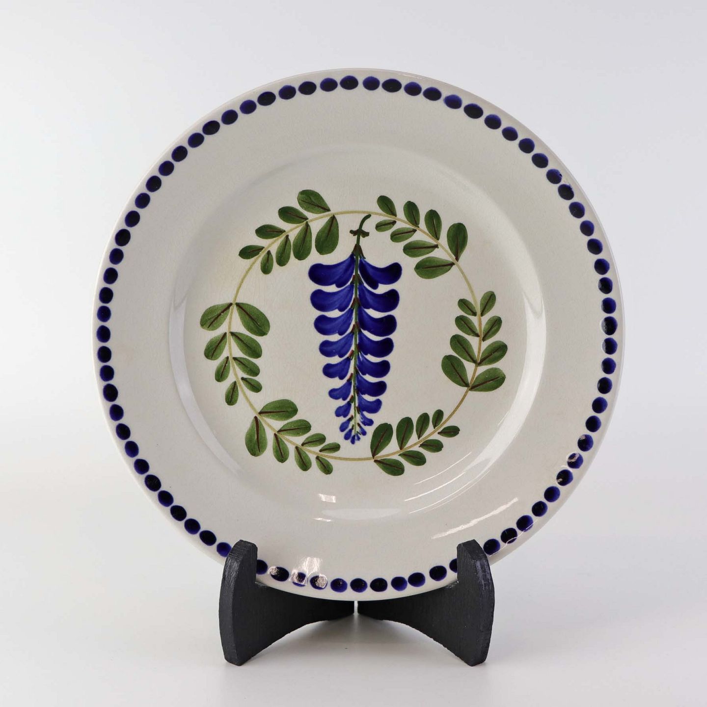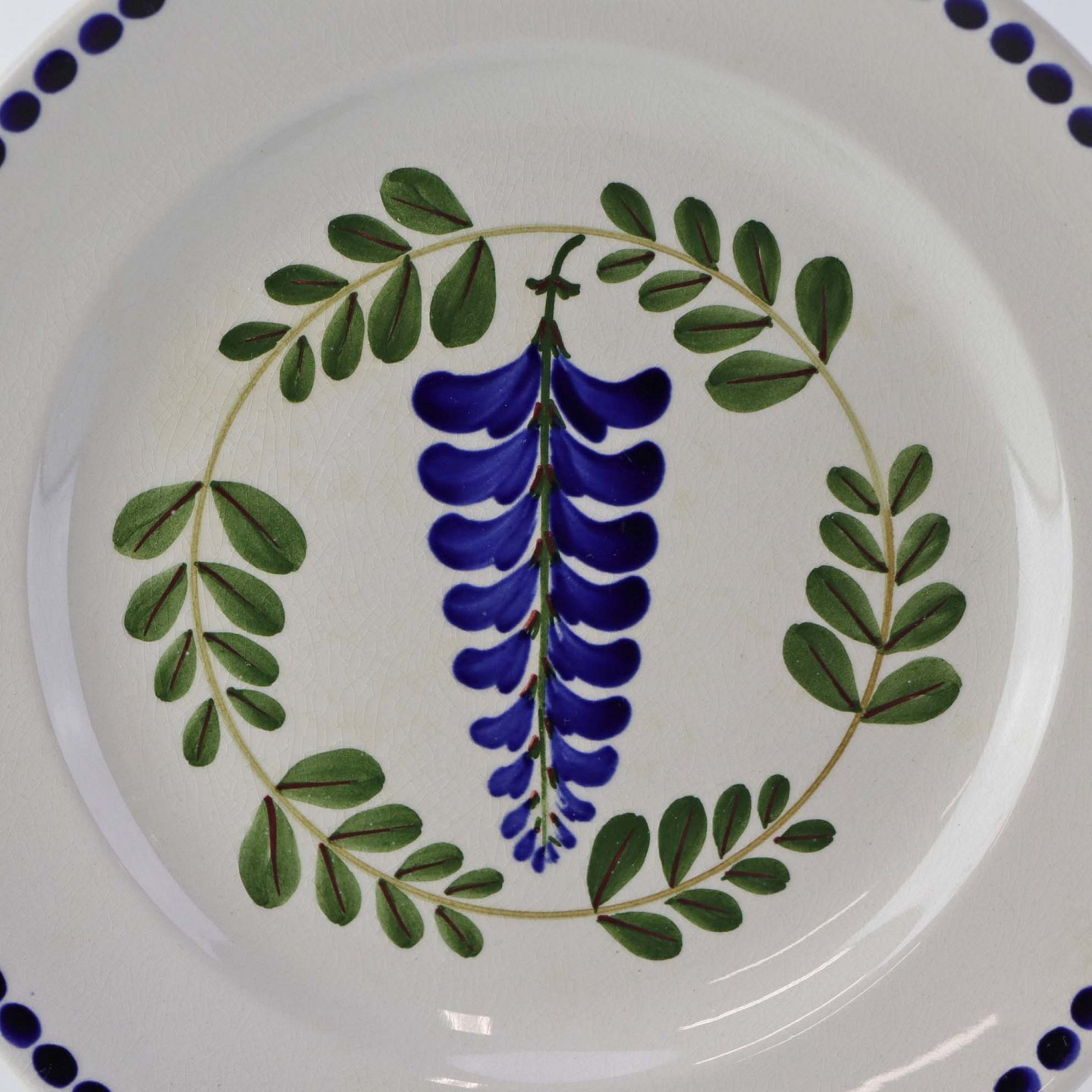 Fajancestel med dekoration af ranker af blåregn og blade på lys baggrund afsluttet med kant af runde blå pletter.
