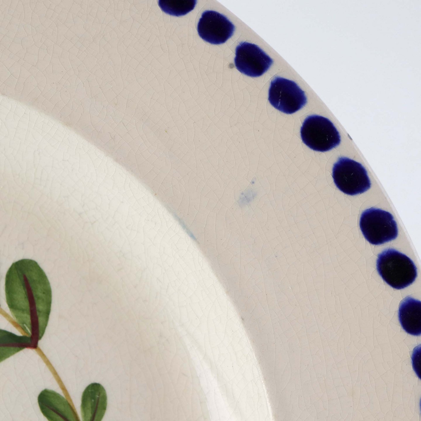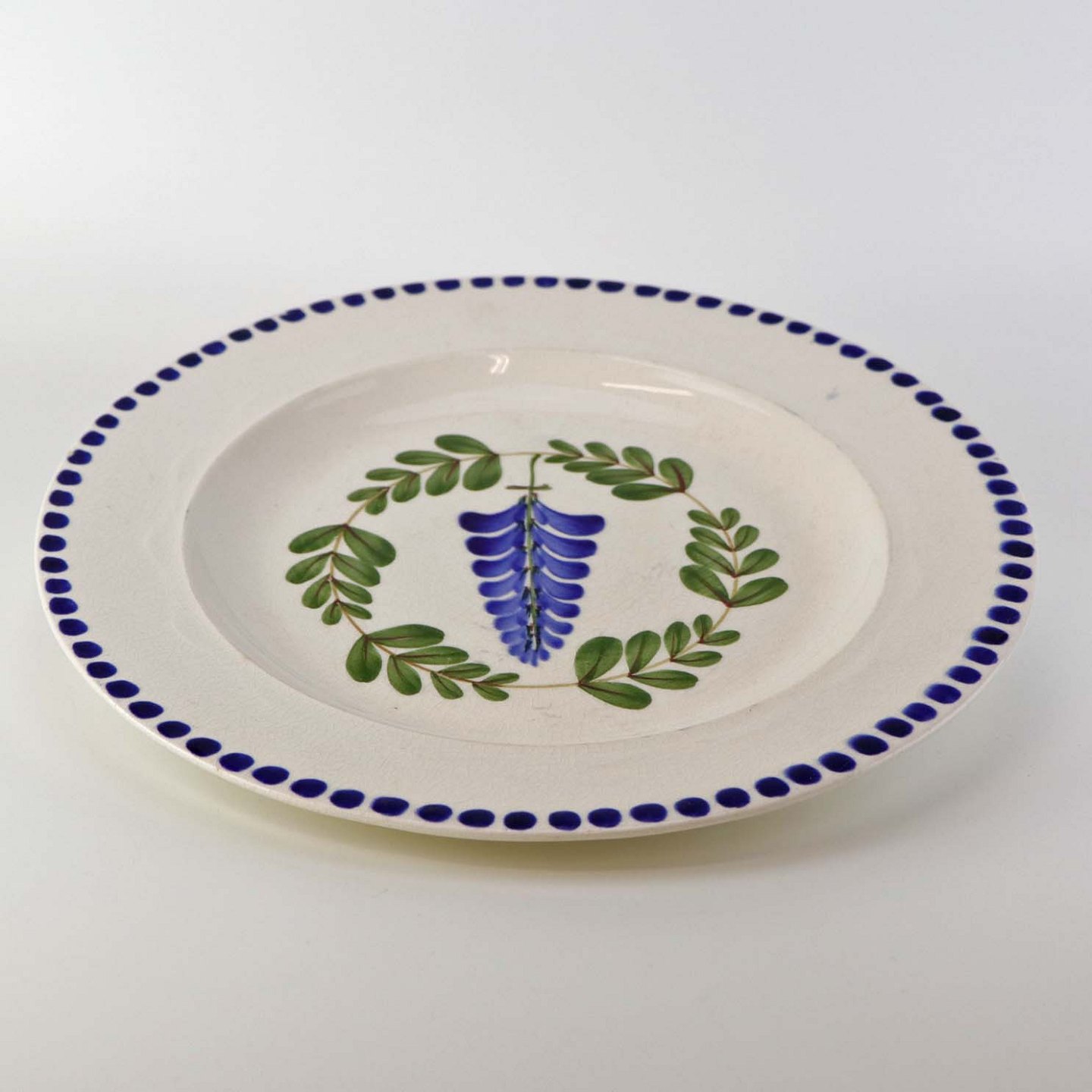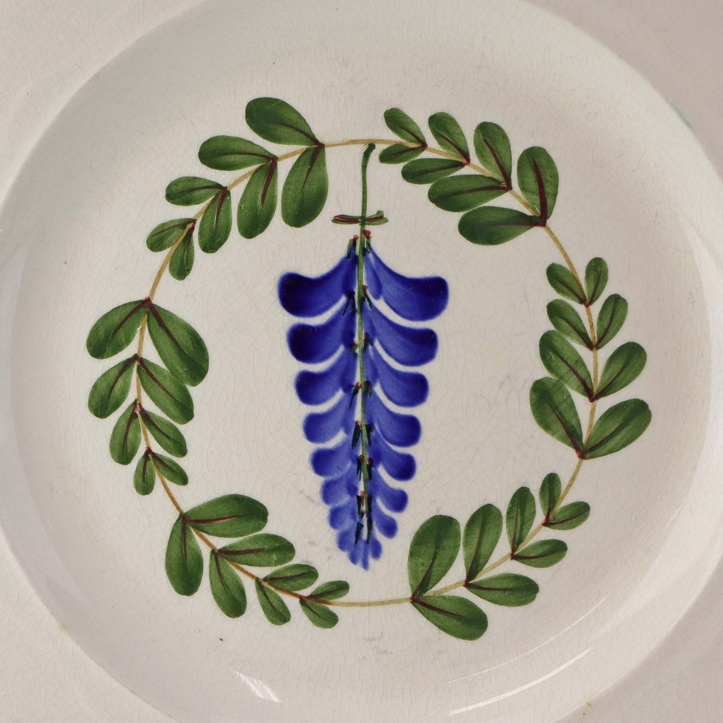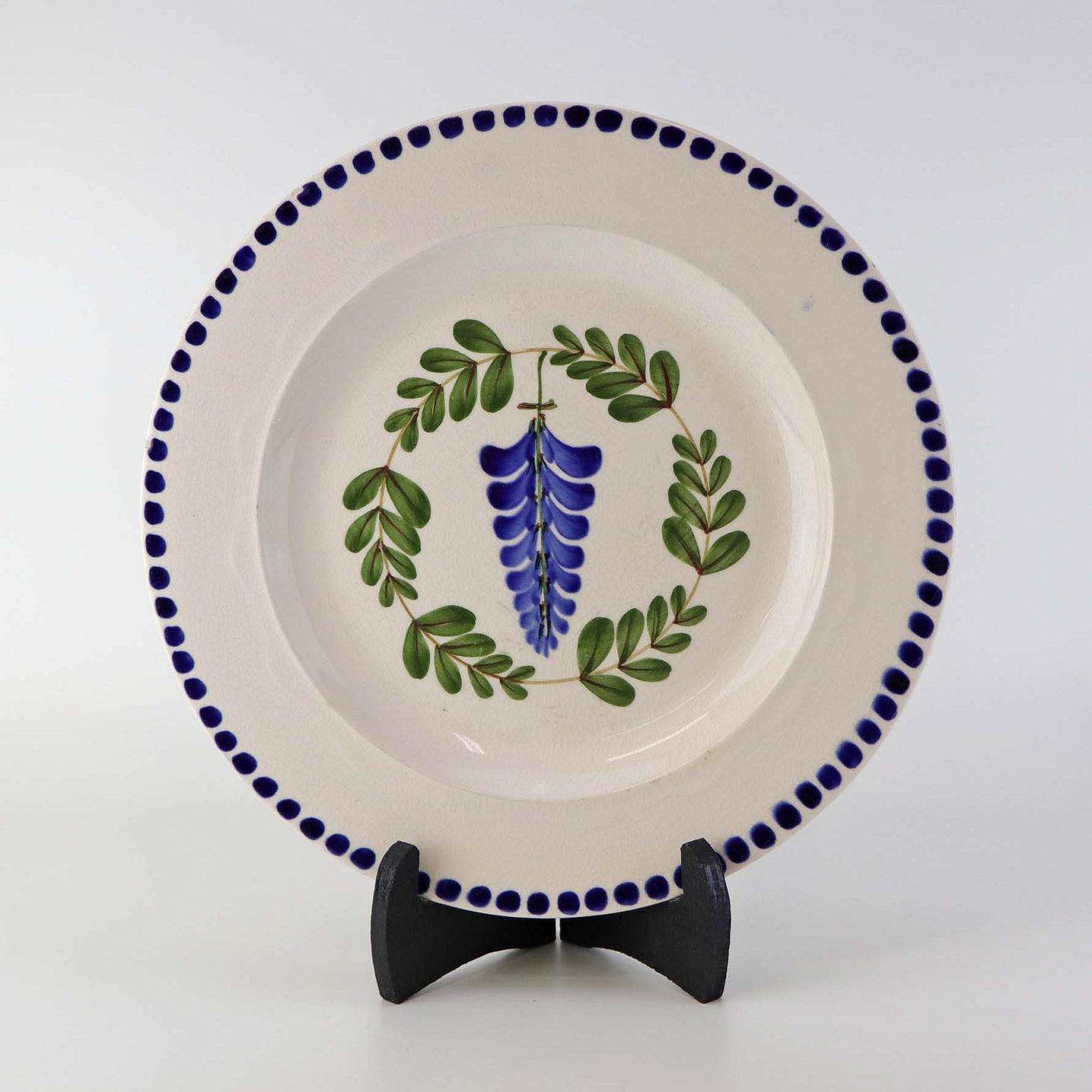 Fajancestel med dekoration af ranker af blåregn og blade på lys baggrund afsluttet med kant af runde blå pletter.