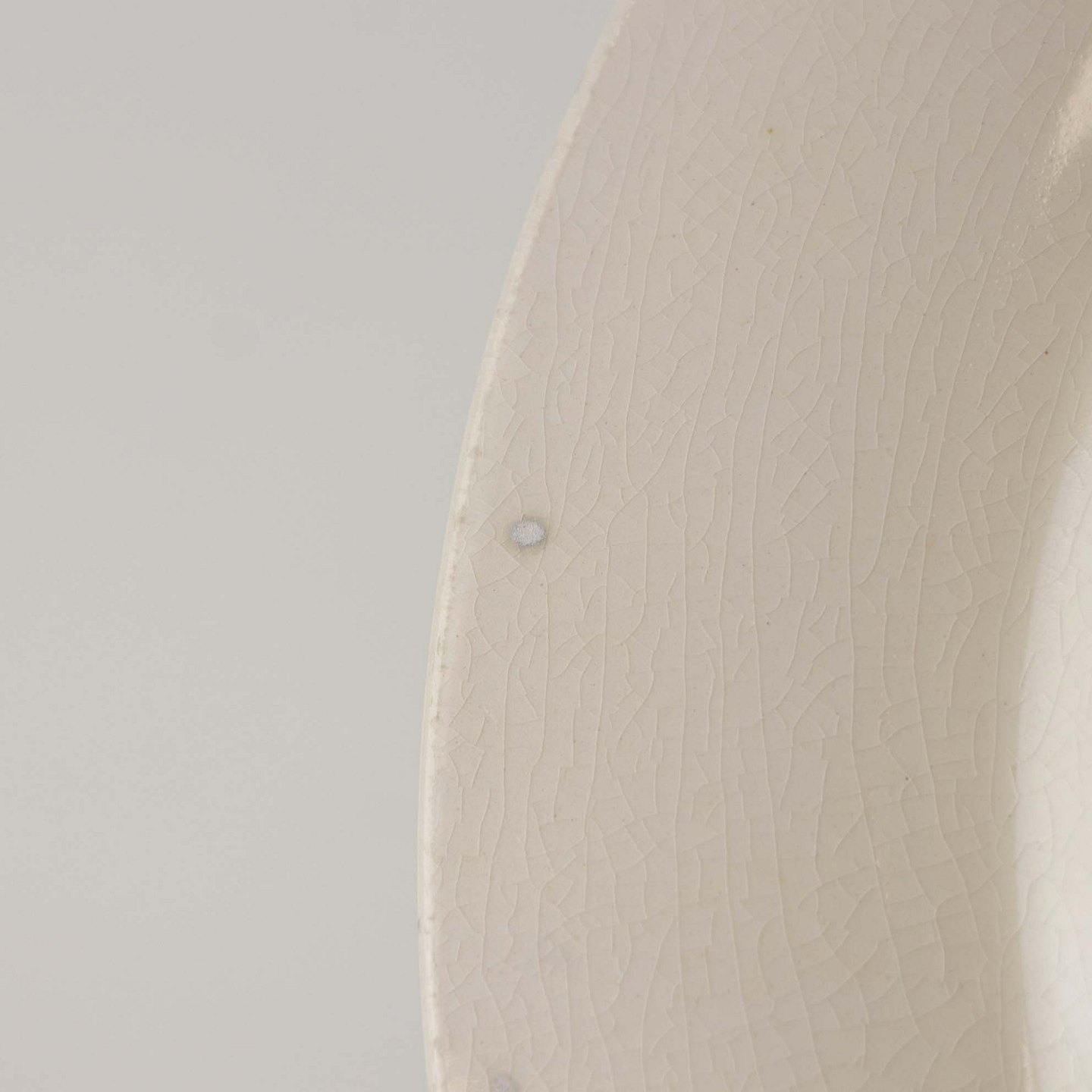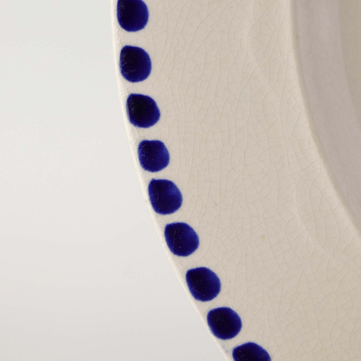 Fremstår med krakkeleringer i glasuren, enkelte mindre områder med brunering og en blå plet under glasuren.