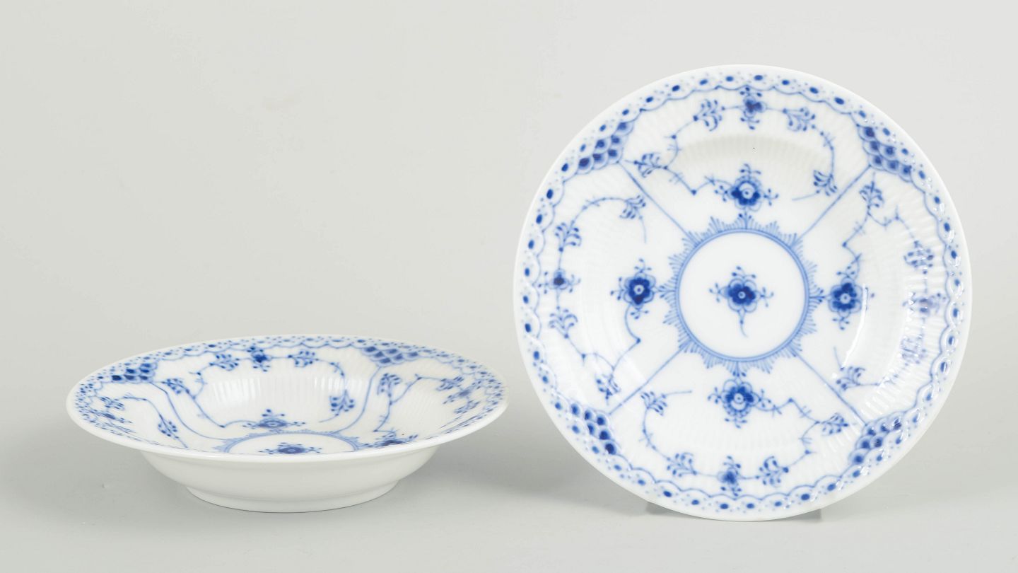 Royal Copenhagen Blue Fluted Half Lace, set of two small deep plates.
