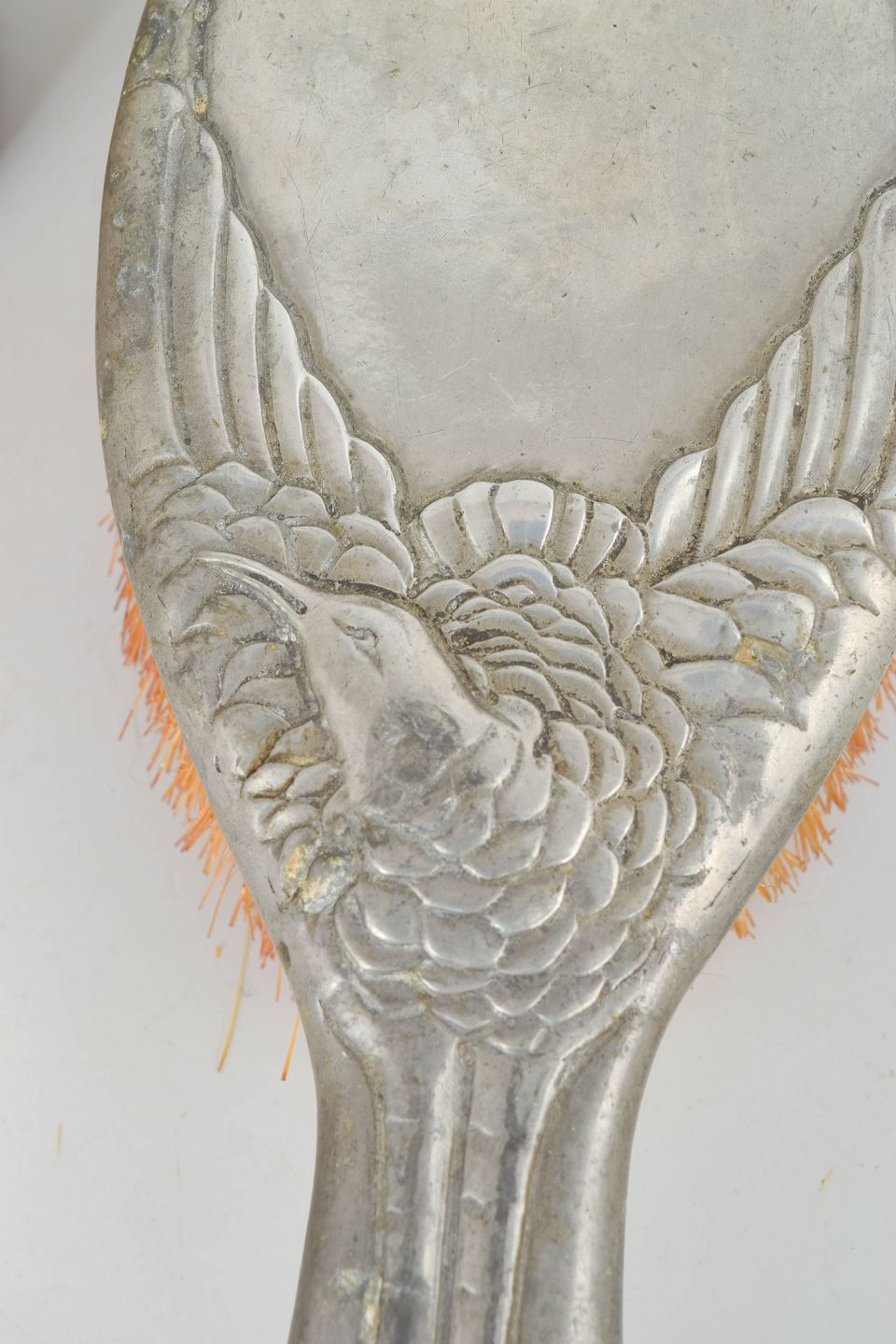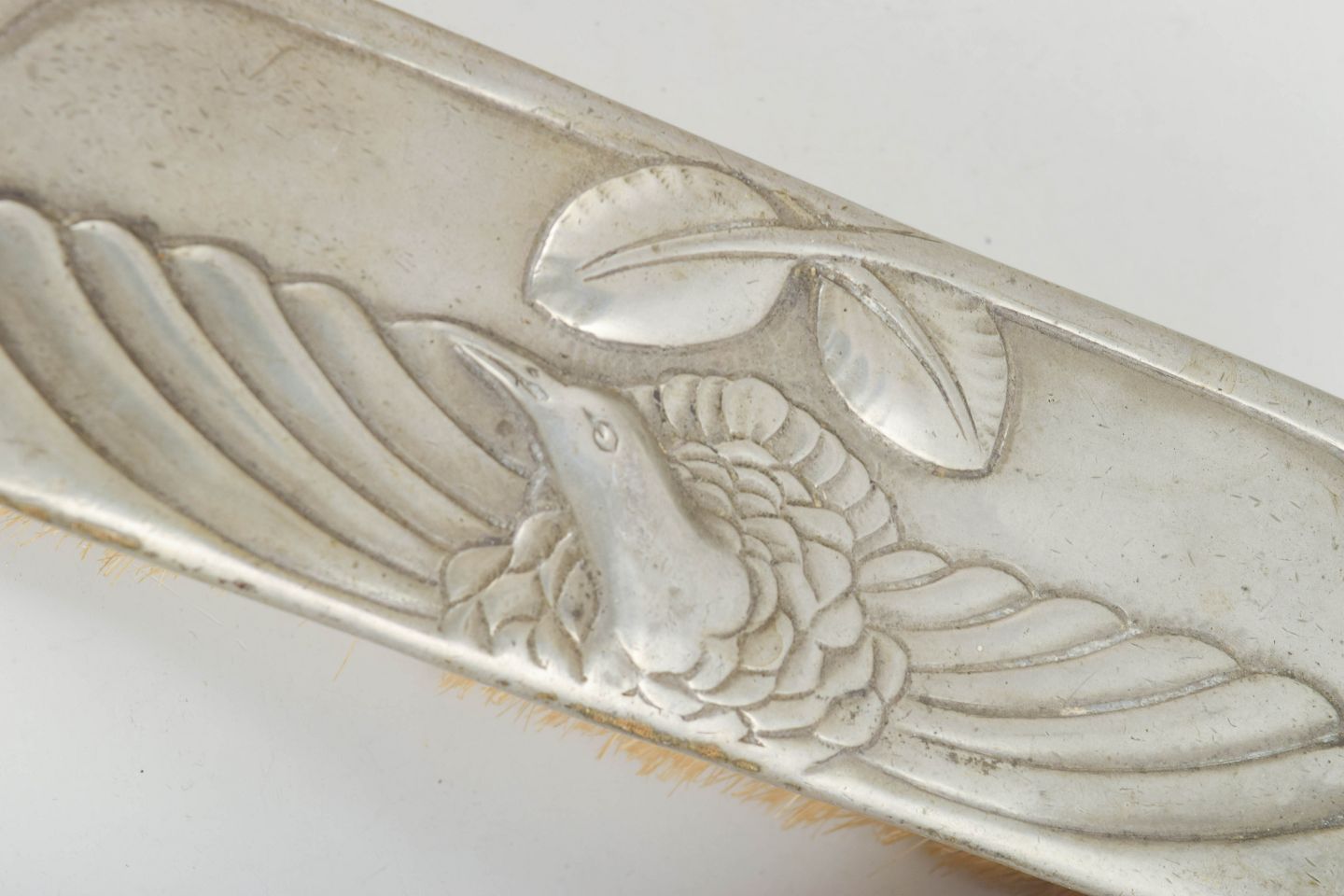 Brush set in pewter made in Art Nouveau style with relief decoration of herons and stylised natural motifs. The set consists of two brushes with decorative handles. Model Hejre.