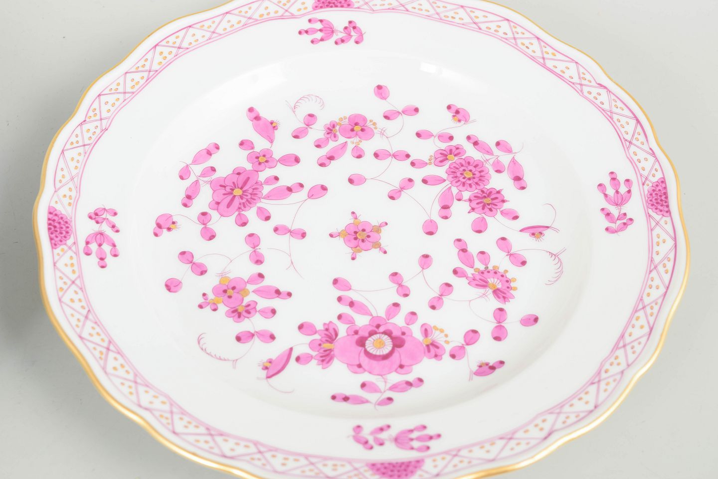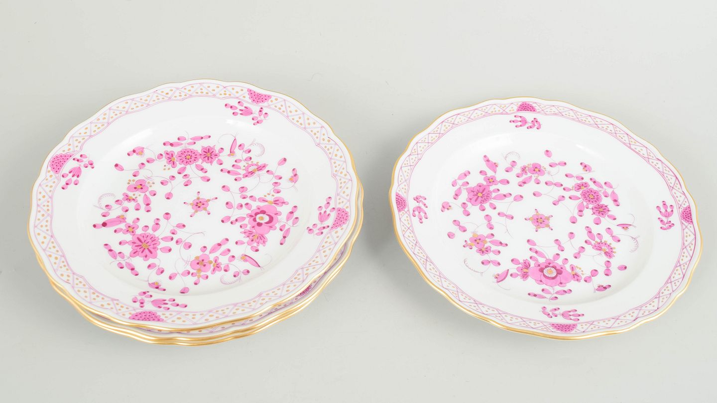 Set of four salad plates in hand-painted porcelain with floral decoration in pink tones and gilded rim.
