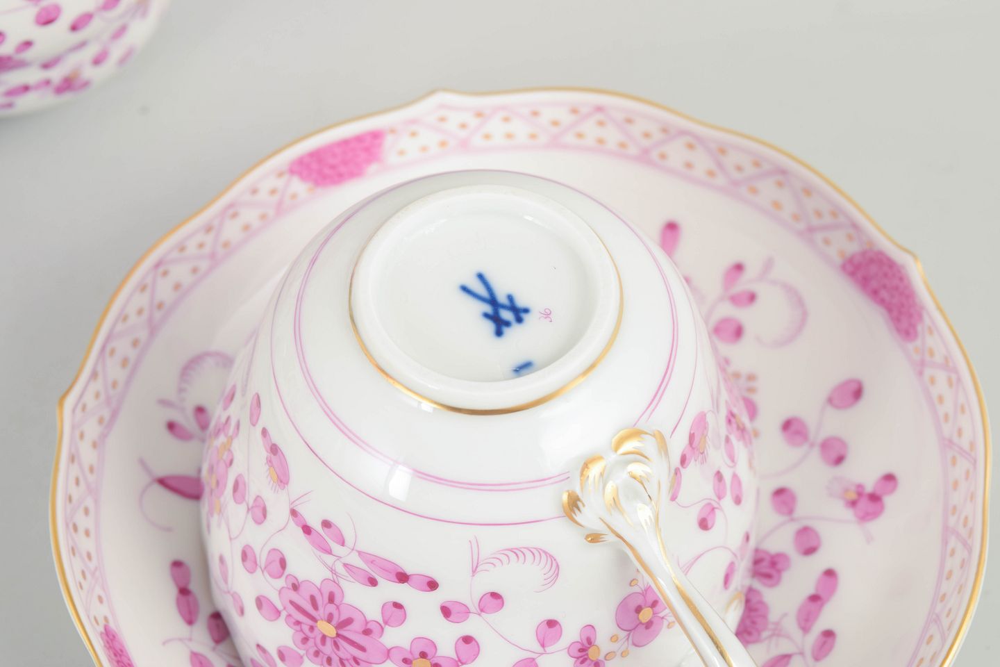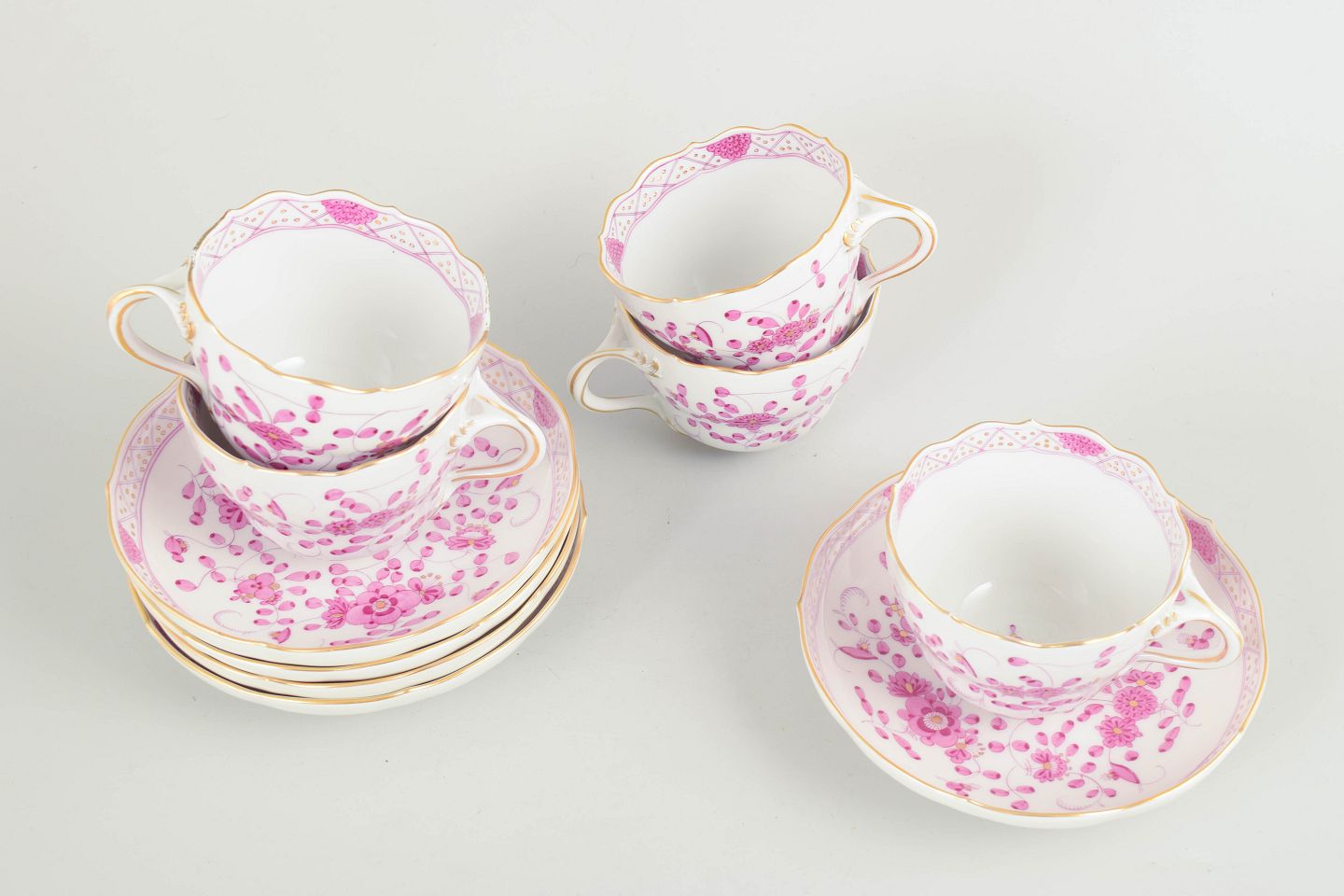 Meissen, "Pink Indian" set of five large coffee cups with matching saucers.