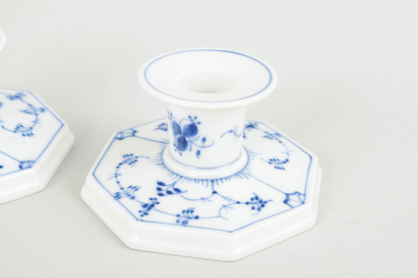A pair of candlesticks in hand-painted porcelain from Blue Fluted Plain with classic underglaze decoration in cobalt blue.