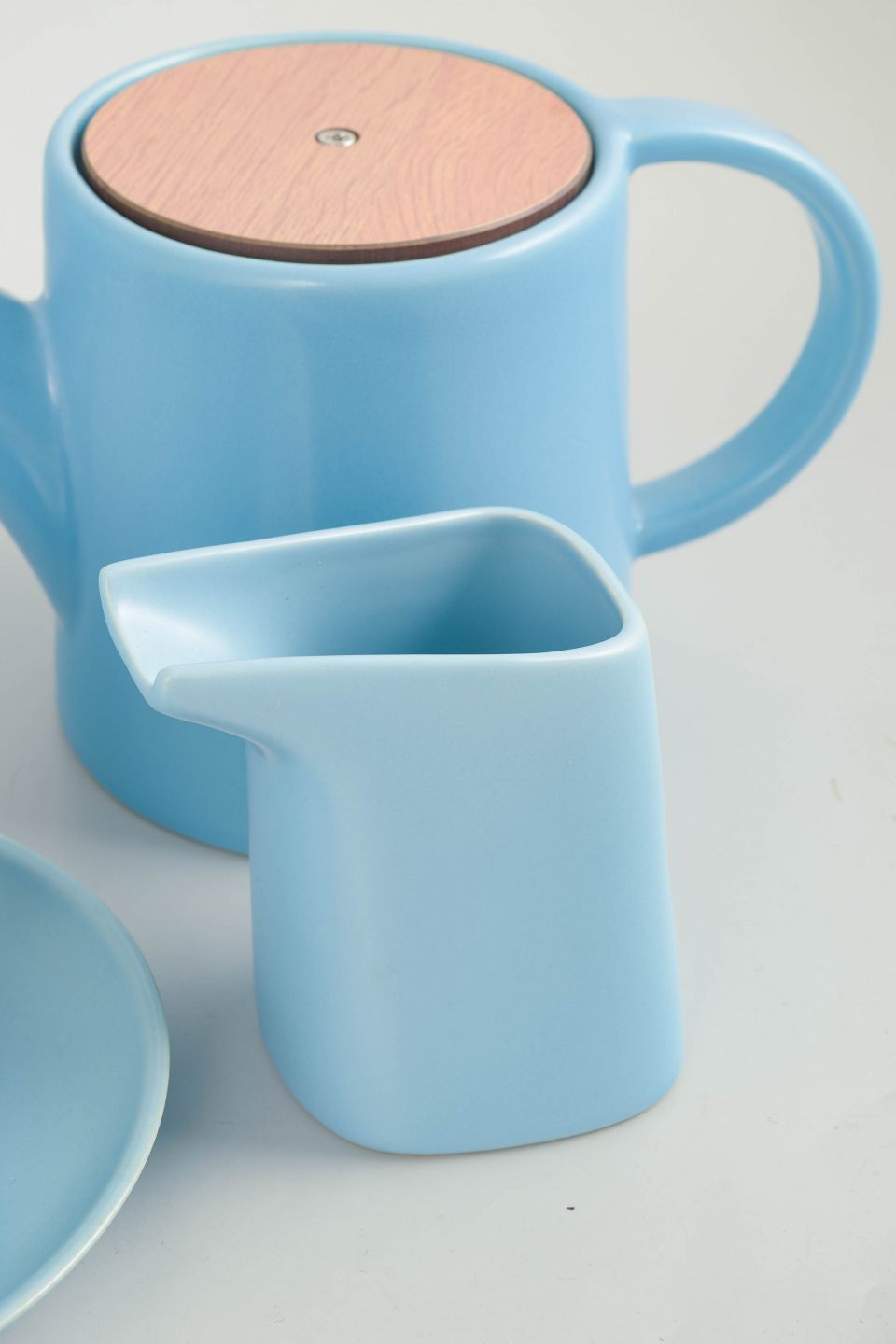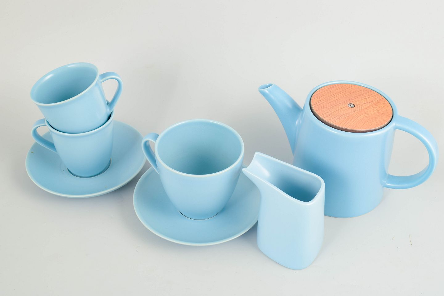 Stoneware tea set consisting of three mugs, teapot, creamer and saucers. Made in a light blue glaze with simple modern forms. Marked Höganäs Keramik Made in Sweden model 3.