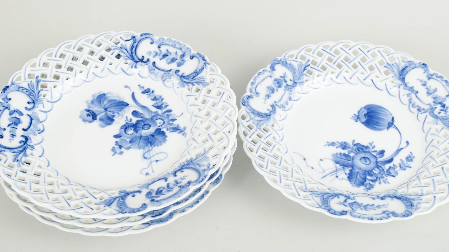 Royal Copenhagen was founded in 1775 in Copenhagen under royal patronage. The factory is internationally recognised for its hand-painted porcelain and high artistic standards. Blue Flower was introduced in the eighteenth century and continued into the twentieth century, characterised by its naturalistic floral decoration and distinctive pierced rim.