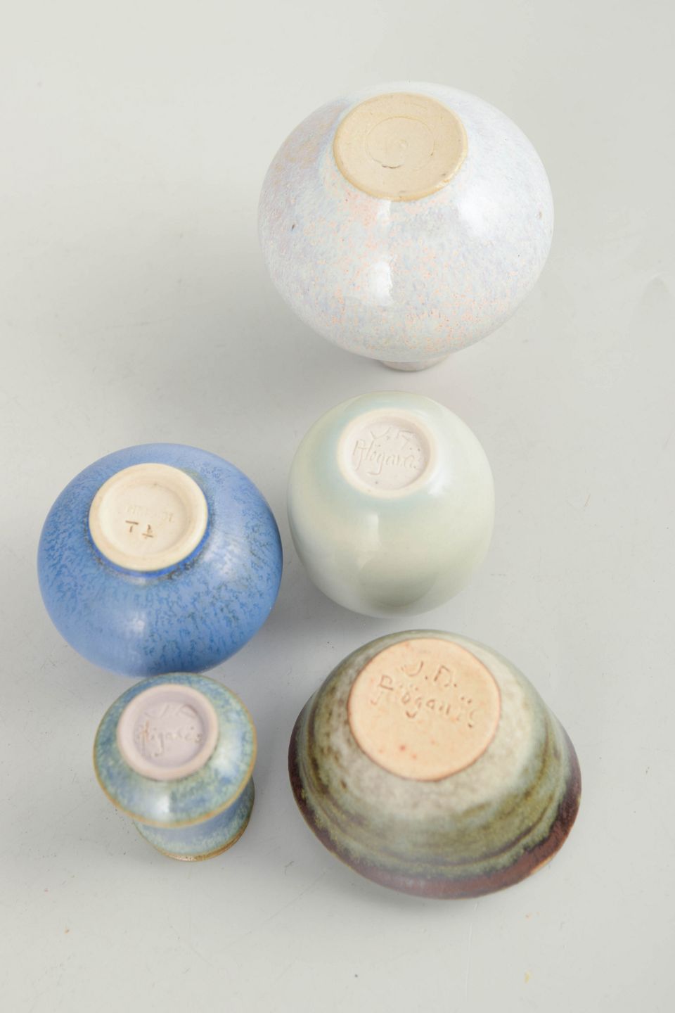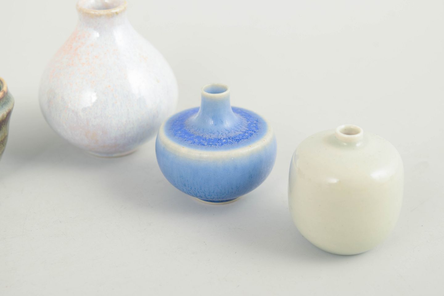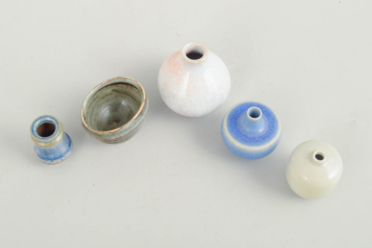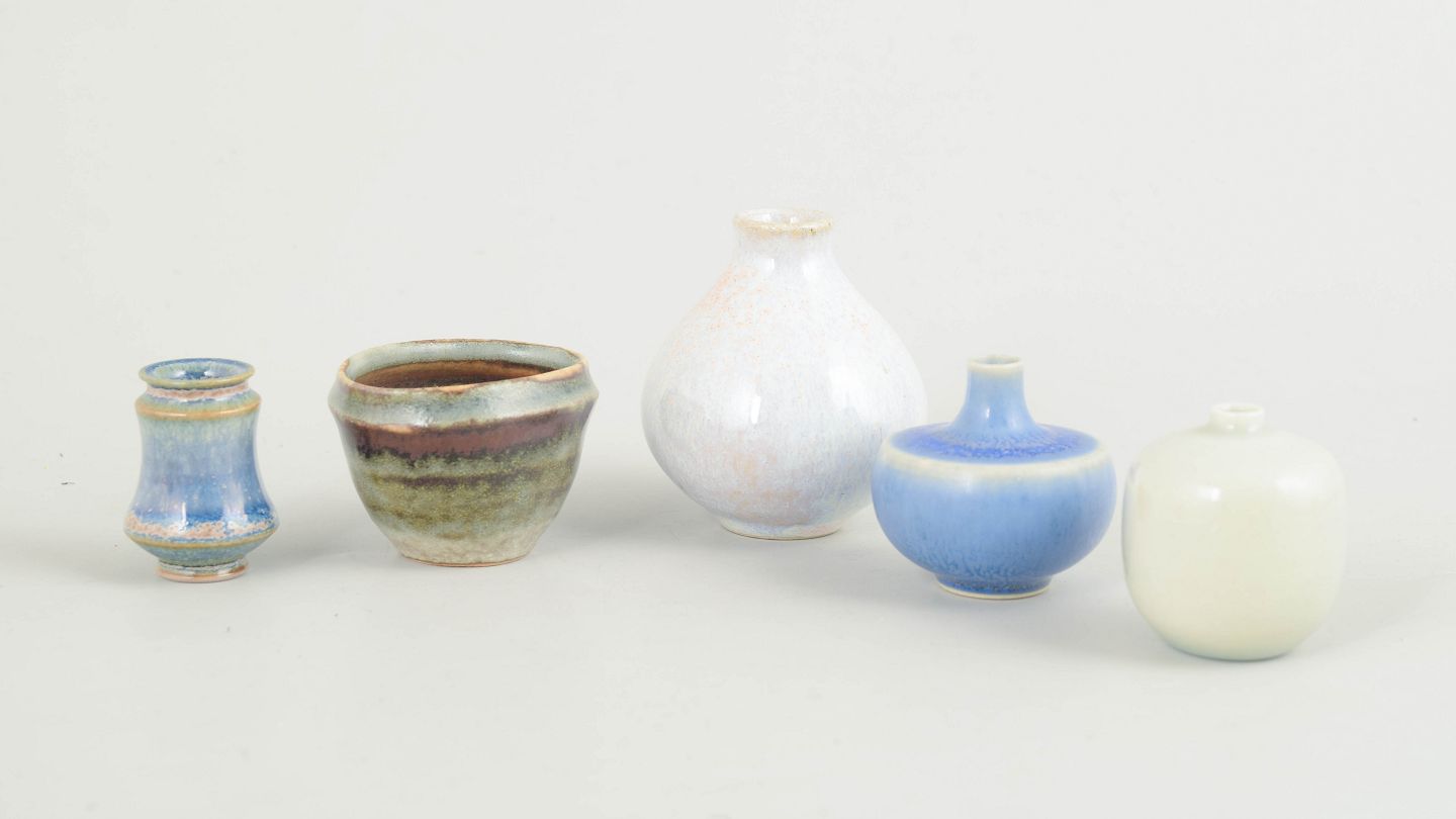 Collection of five miniature ceramic pieces consisting of small bowls and vases in varied forms and glazes. Made in ceramic with multicoloured glazes in blue, green and light tones. Three examples are from Höganäs and others from various makers including one unmarked piece.