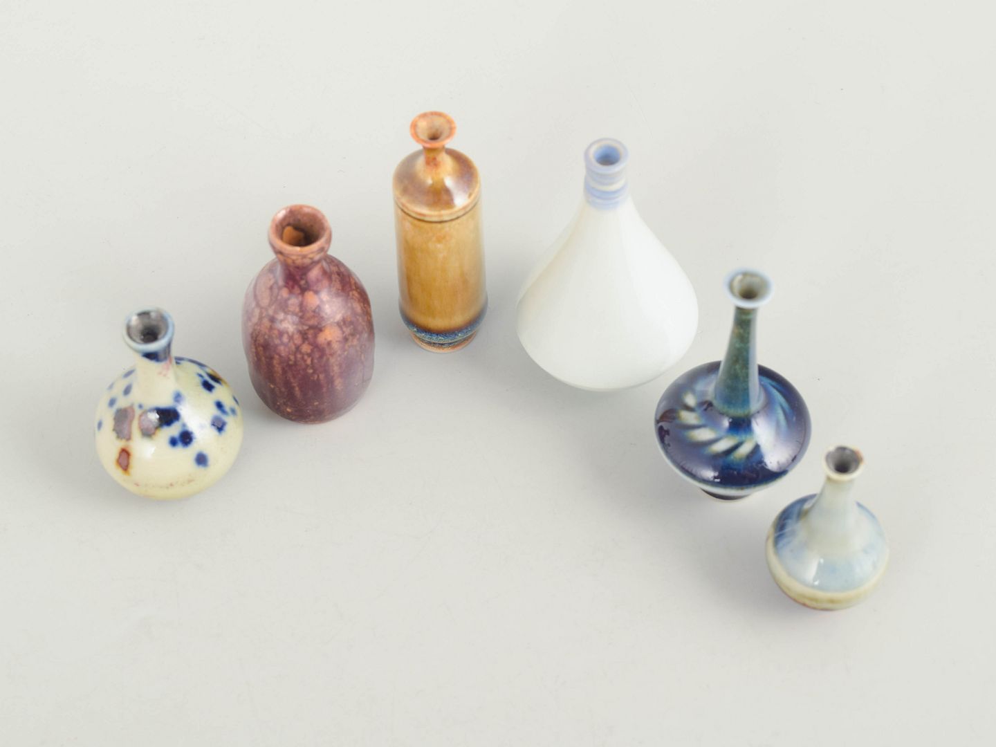 Collection of six miniature ceramic vases in varied forms and glazes. Made in ceramic with multicoloured glazes in blue, brown and light tones. All examples are marked on the base. Examples are from Höganäs and others from various makers.
