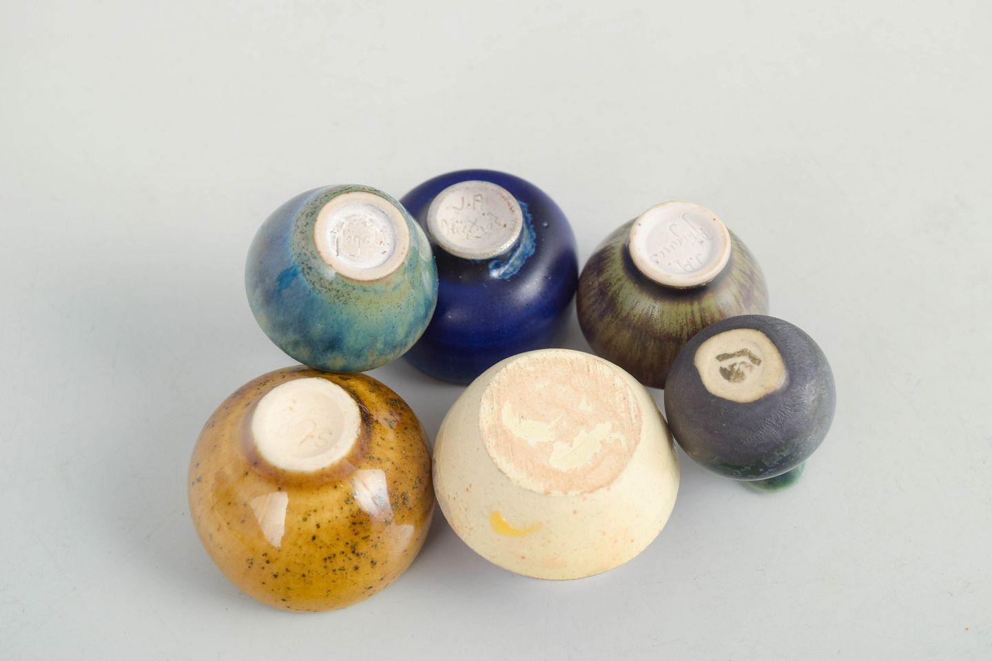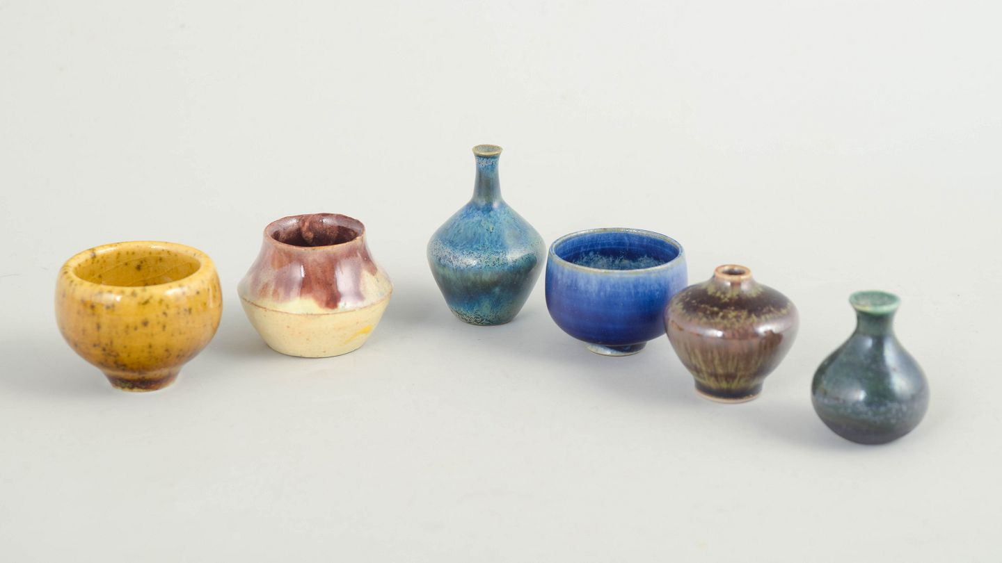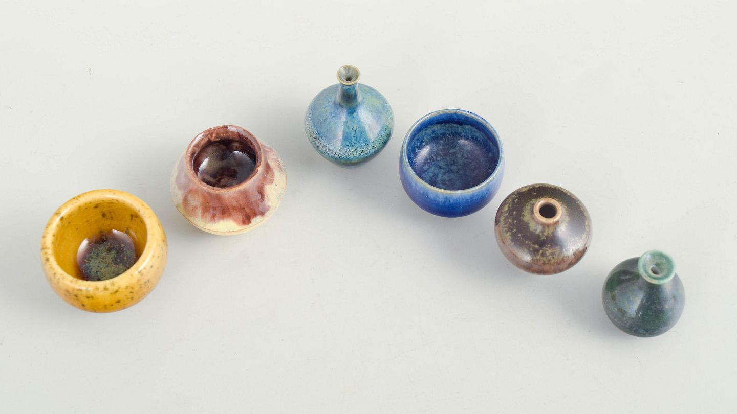 Collection of six miniature ceramic pieces consisting of small bowls and vases in varied forms and glazes. Made in ceramic with multicoloured glazes in blue, brown and yellow tones. Three examples are from Höganäs and others from various makers. Typical decorative miniature ceramics from the 1960s.