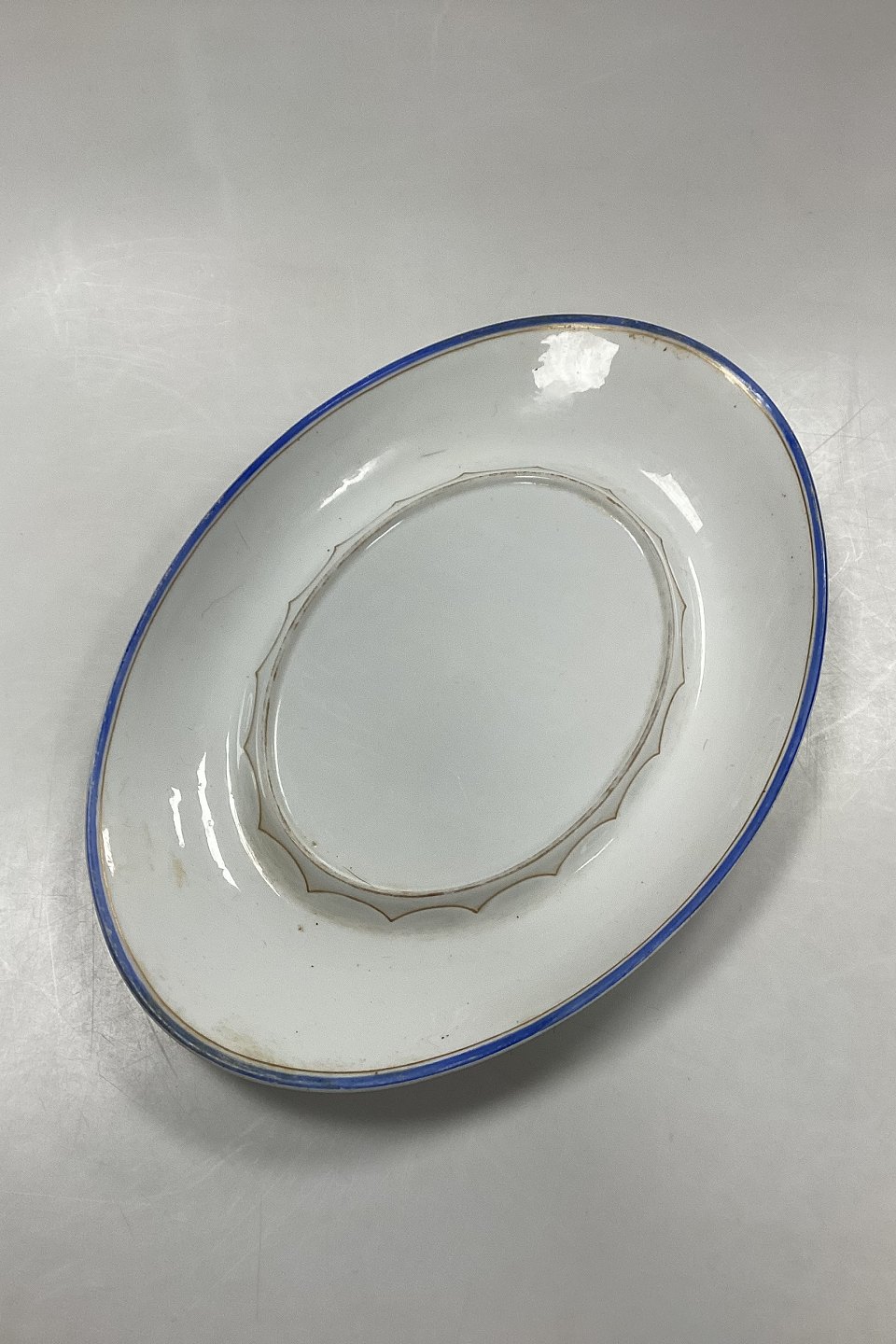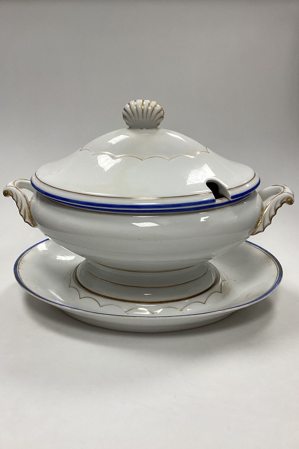 Royal Copenhagen Tureen with saucer No. 282/9056 and 9057. White porcelain with decoration in gold and cobalt blue.Light wear on gold and edges.