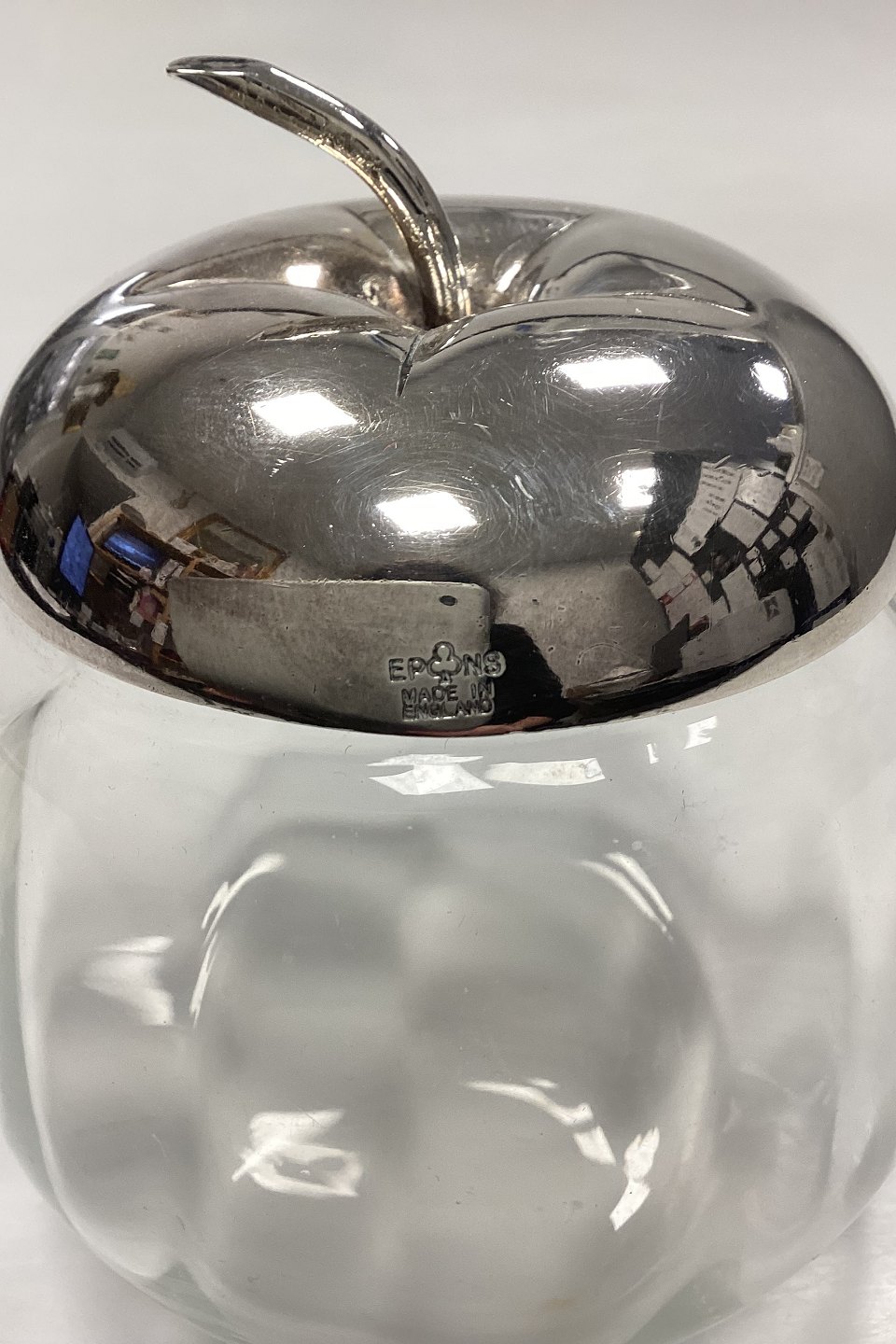 English Silver Plate/EPNS Jam Jar. The glass has optical grooves and the lid is shaped like the top of an apple.