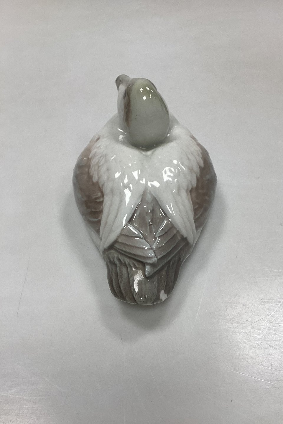 Bing and Grøndahl Figurine of Eider Duck/Drake No. 1507. Signed ?. Jacobsen. The colors are pale in green and beige, unlike a real eider. Has a chip on the tail feather, see photo.