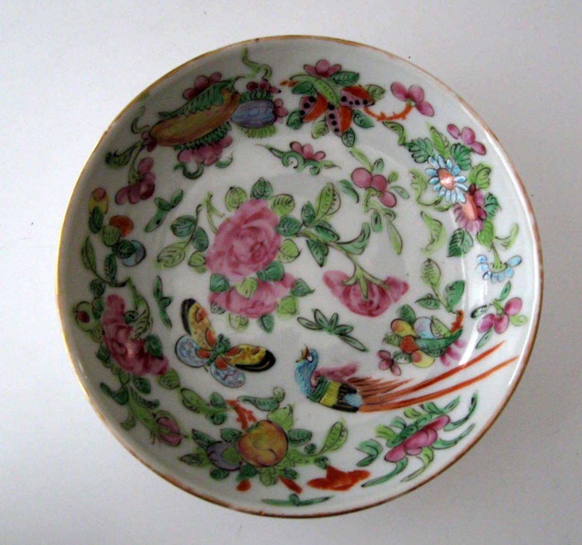 Famille rose cup, China, 19th century. With saucer. Polycrom decoration with roses, birds and insects. Height: 6,5 cm. Dia. saucer: 13 cm.